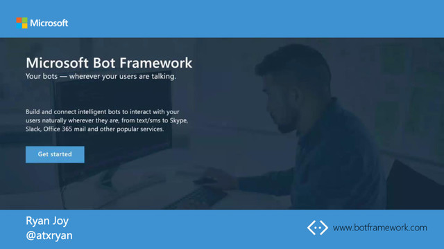 SDKs Connect your bot(s) to text/sms, Office 365 mail, Skype, Slack, and other services. Build great dialogs within your Node.js or C# bot Try, use, and add published bots to the world’s top conversation experiences • Register, connect, publish and manage your bot through the bot dashboard • Message routing • Automatic translation to 30+ languages • User and state management • Embeddable web chat control • Debugging tools • Open source SDK on Github • From simple built-in prompts and command dialogs to simple to use yet sophisticated ‘FormFlow’ dialogs • Libraries, samples and tools to make a great conversationalist • Chat emulator • Leverage related services available in Cognitive Services • Public directory of bots registered and approved with Bot Framework • Users can try your bot from the directory via the web chat control • Users can discover and add your bot to the channels on which it is configured