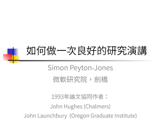 Simon Peyton-Jones's classic 1993 talk, translated to Traditional Chinese. Source: http://research.microsoft.com/en-us/um/people/simonpj/papers/giving-a-talk/giving-a-talk.htm