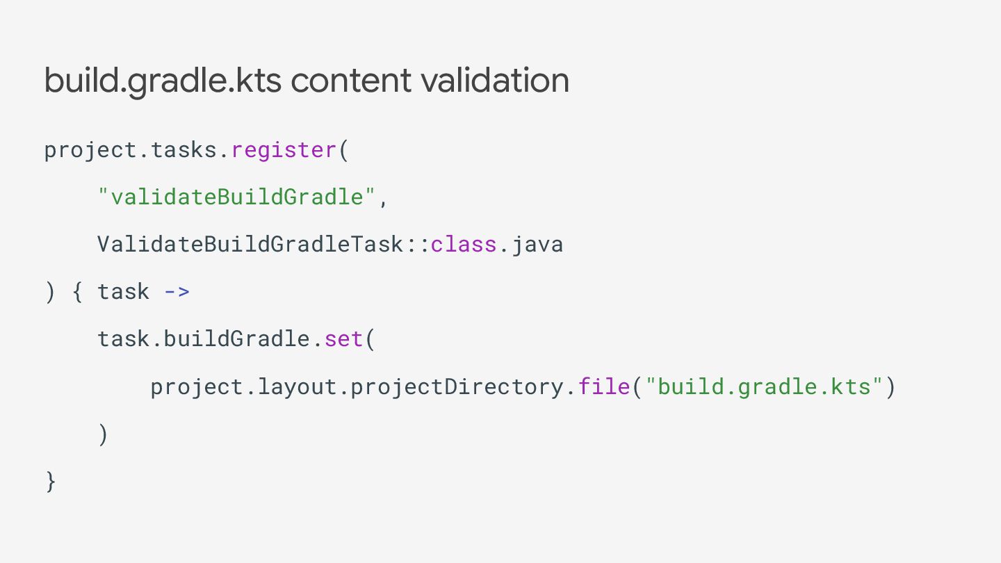 abstract val build: RegularFileProperty @TaskAction fun validate() { val buildContents = build.get().asFile.readText() if (buildContents.contains("kotlin {")) throw Exception("Do not configure Kotlin ...") } }