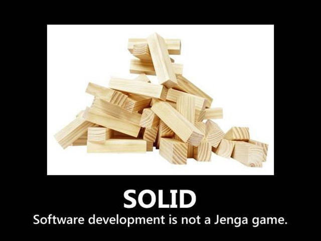 Demotivator-style pictures for SOLID design principles.
