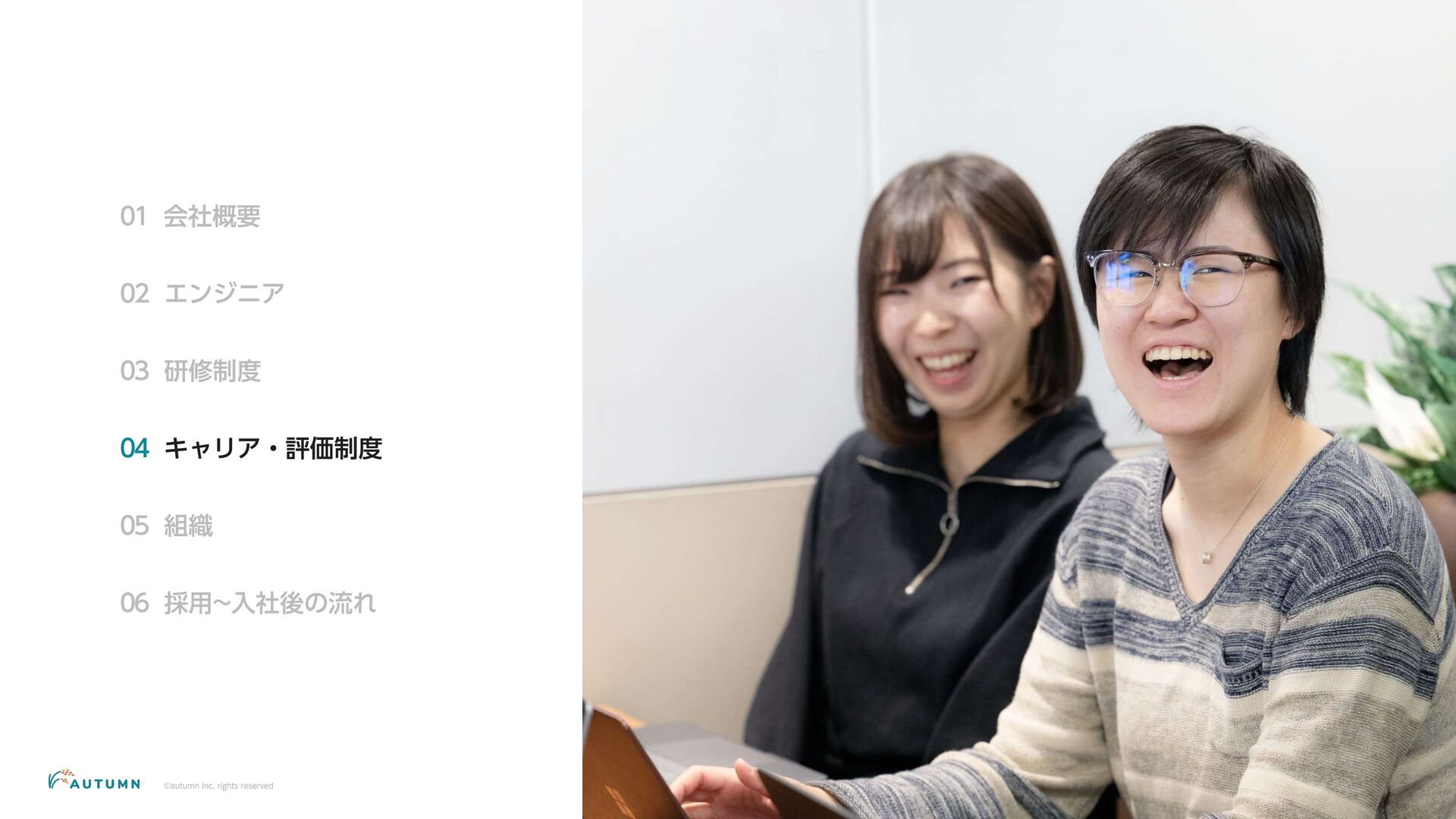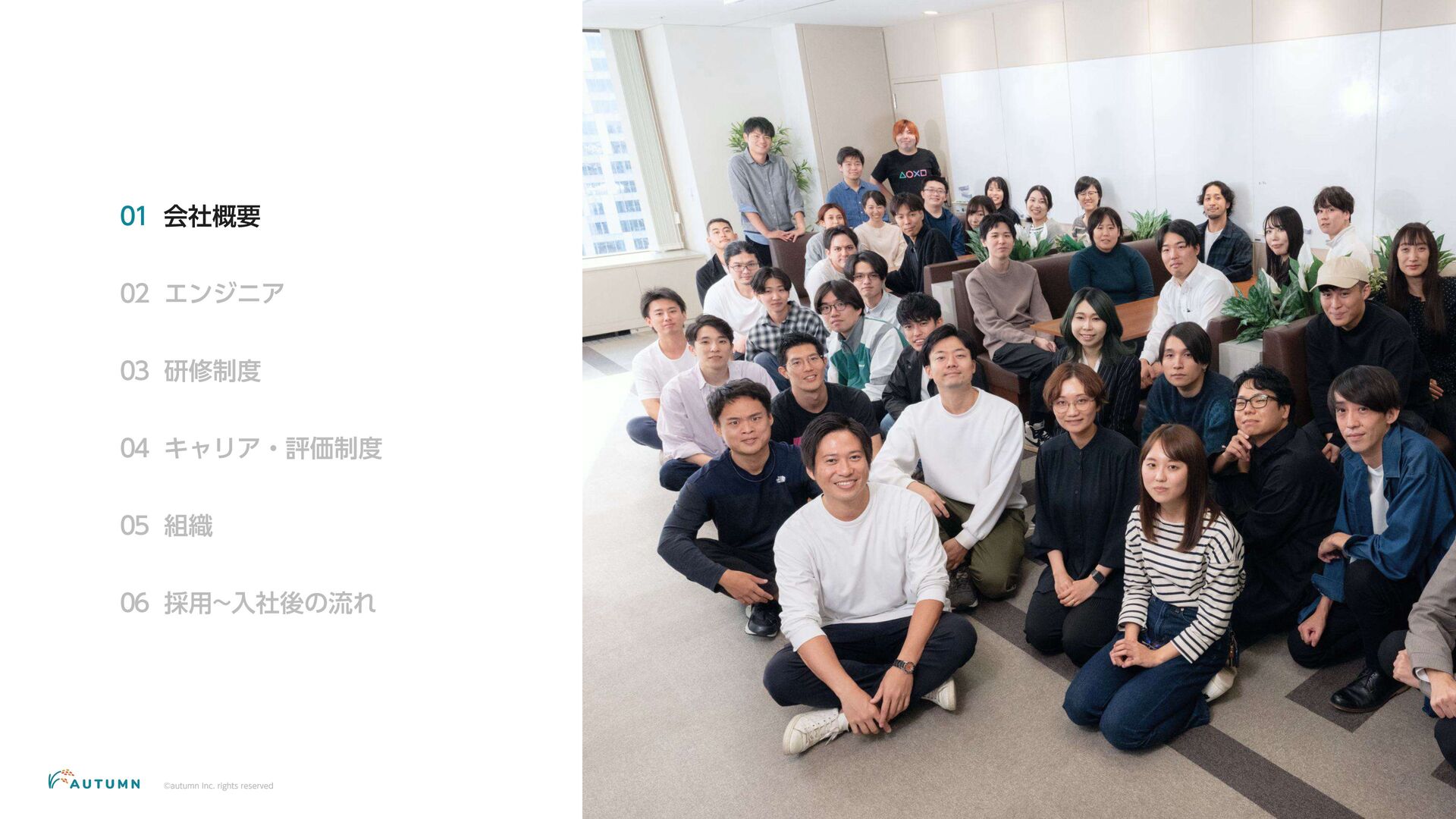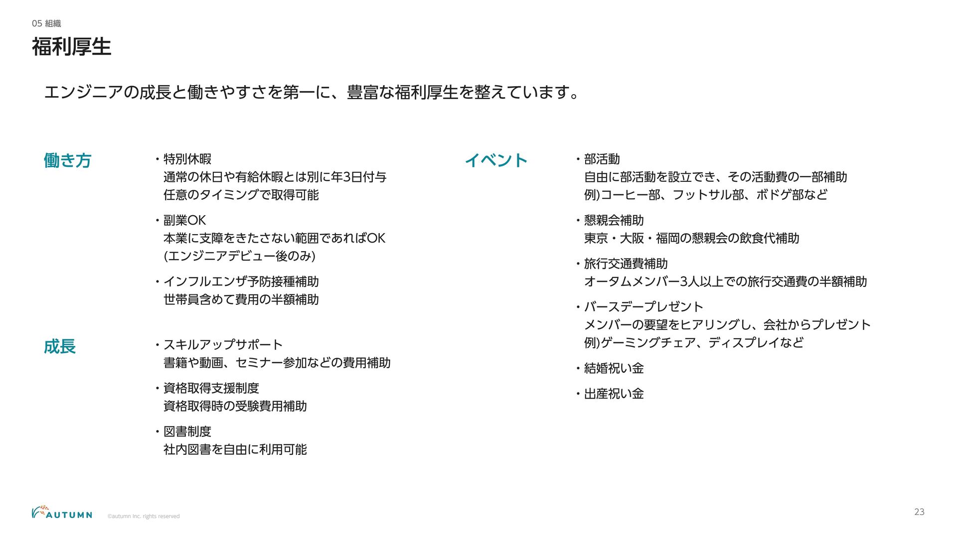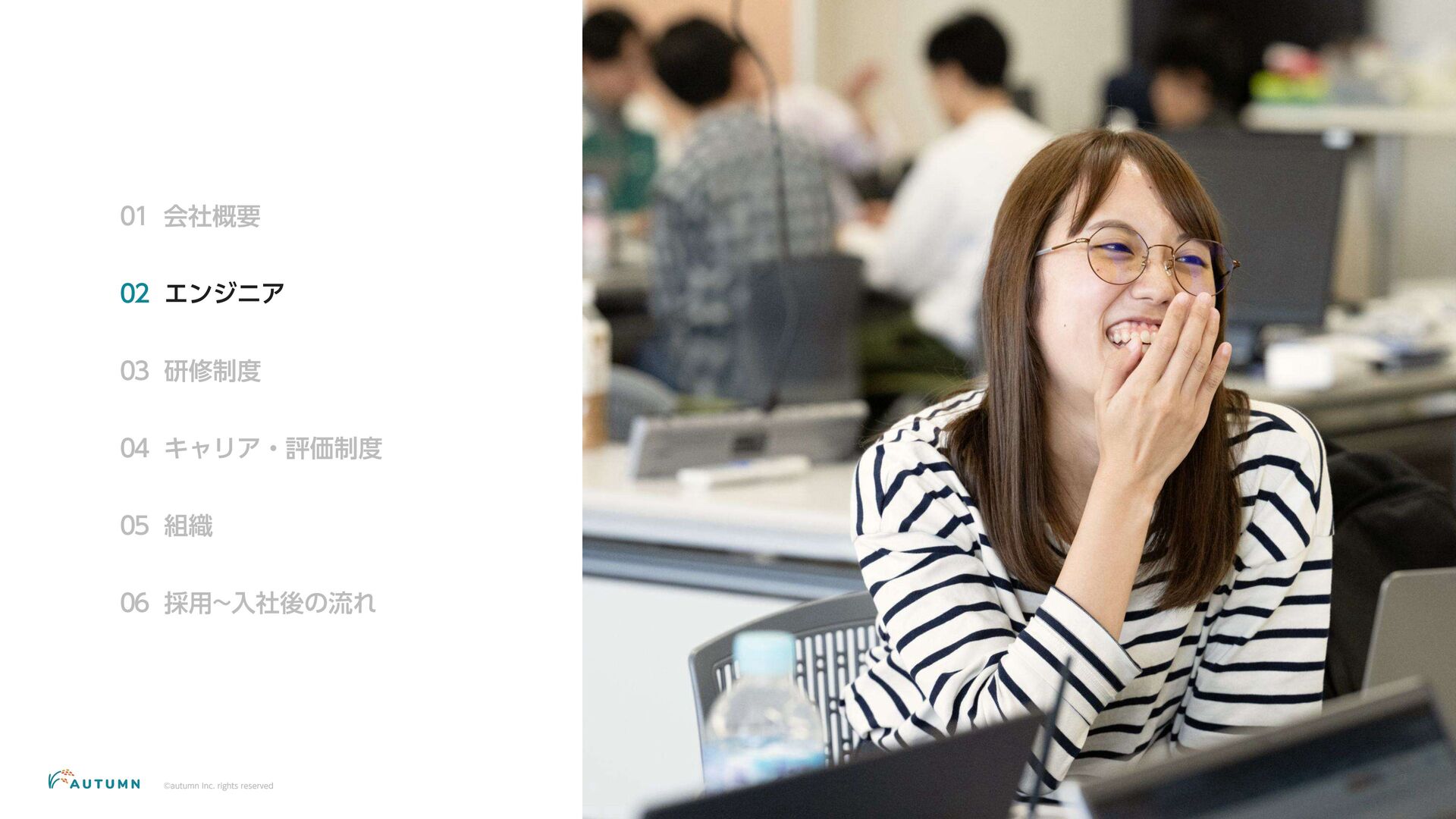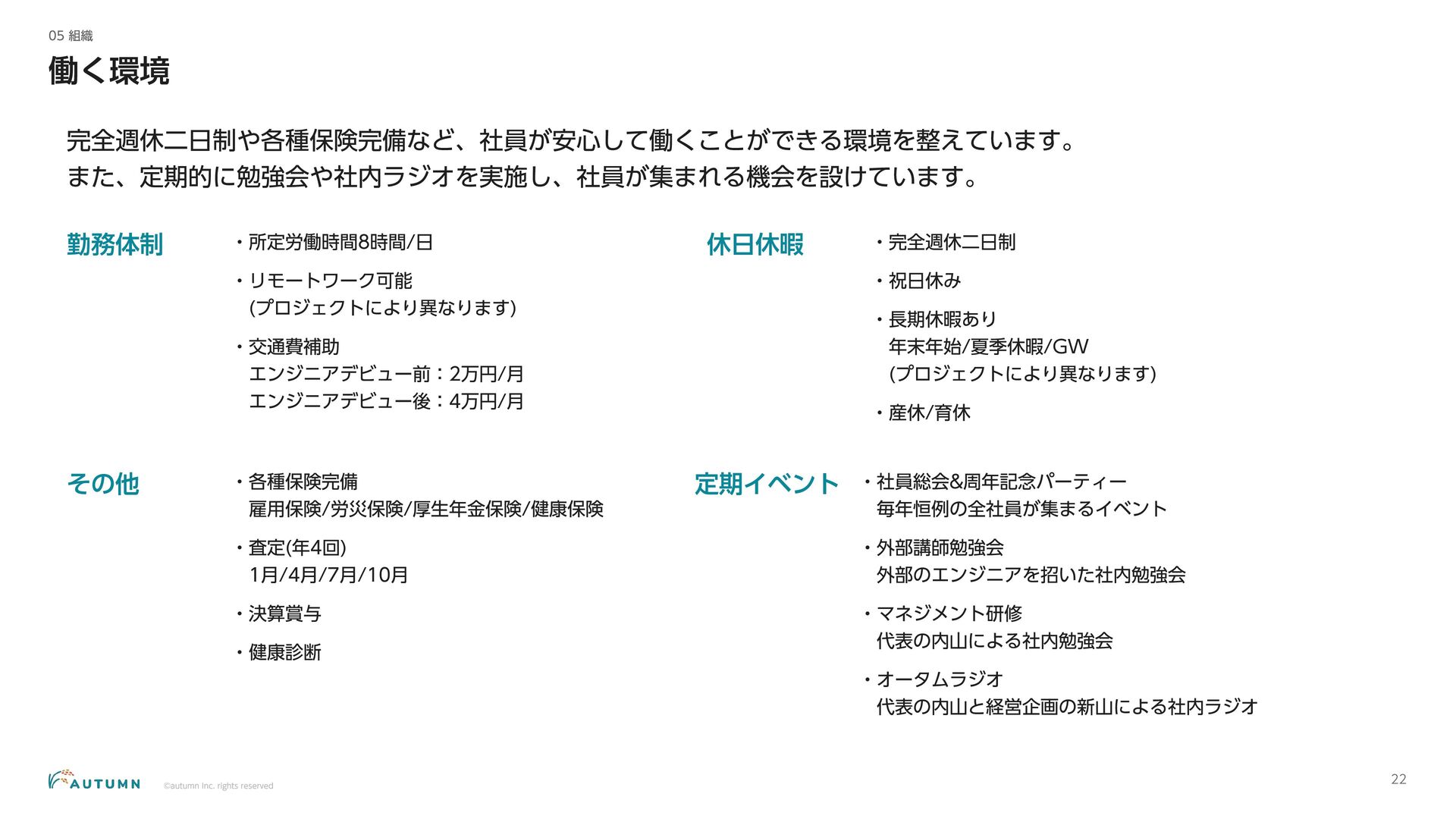 ・リモートワーク可能 (プロジェクトにより異なります) ・交通費補助 エンジニアデビュー前:2万円/月 エンジニアデビュー後:4万円/月 休日休暇 ・完全週休二日制 ・祝日休み ・長期休暇あり 年末年始/夏季休暇/GW (プロジェクトにより異なります) ・産休/育休 その他 ・各種保険完備 雇用保険/労災保険/厚生年金保険/健康保険 ・査定(年4回) 1月/4月/7月/10月 ・決算賞与 ・健康診断 定期イベント ・社員総会&周年記念パーティー 毎年恒例の全社員が集まるイベント ・外部講師勉強会 外部のエンジニアを招いた社内勉強会 ・ マネジ メント 研修 代表の内 山による社内勉強会 ・ オー タムラジ オ 代表の内 山と経営企画の 新山による社内 ラジ オ 完全週休二日制 や各種保険完 備な ど、社員が 安心して働 くことが できる 環境を 整えています 。 また 、定期 的に勉強会 や社内 ラジ オを 実施し、社員が集ま れる 機会を 設けています 。