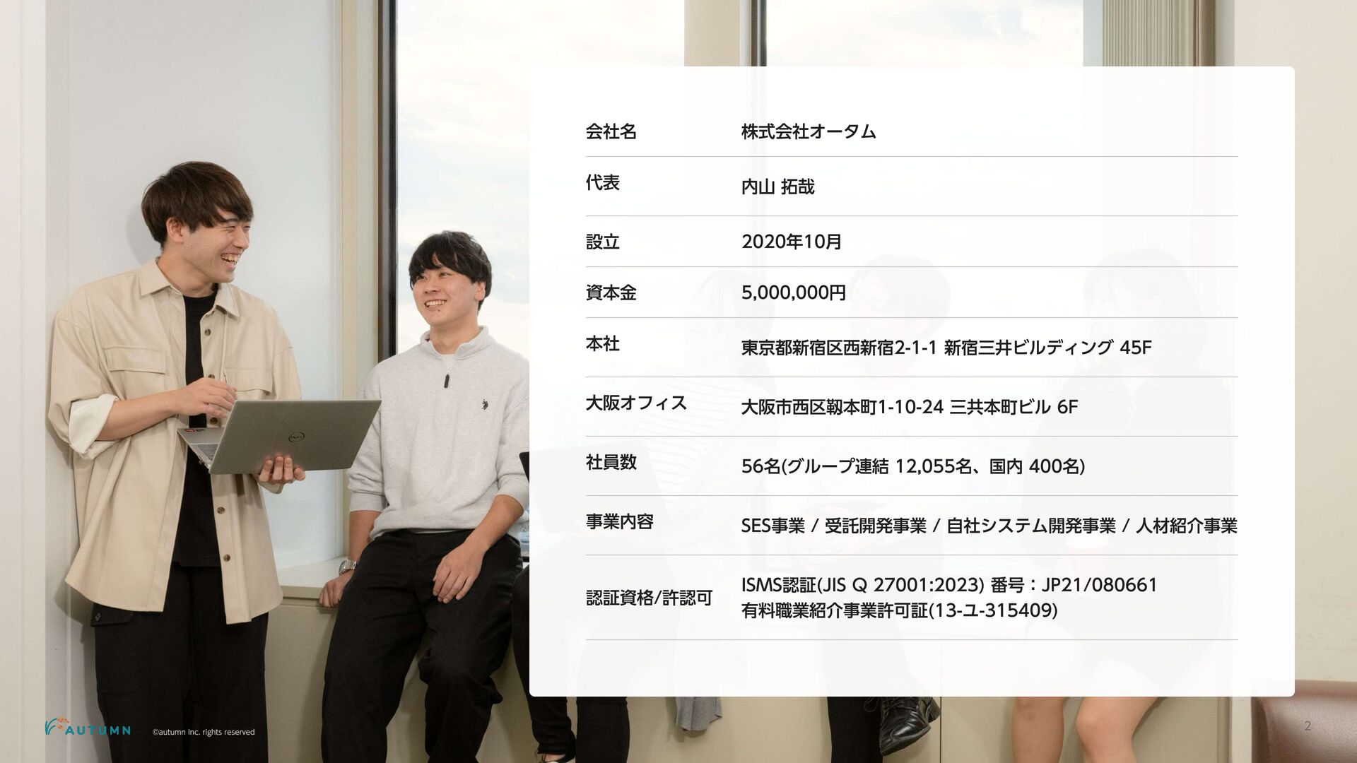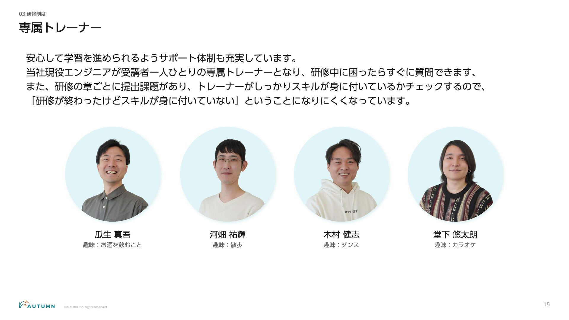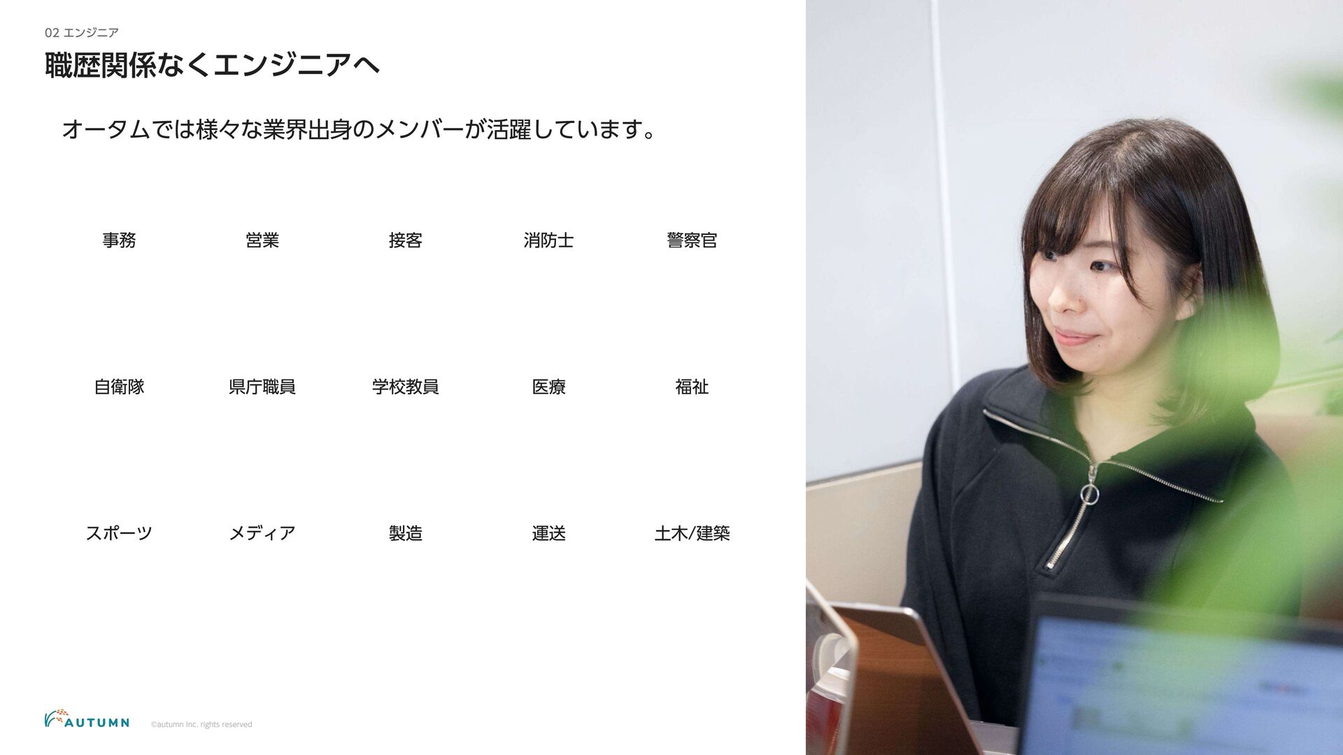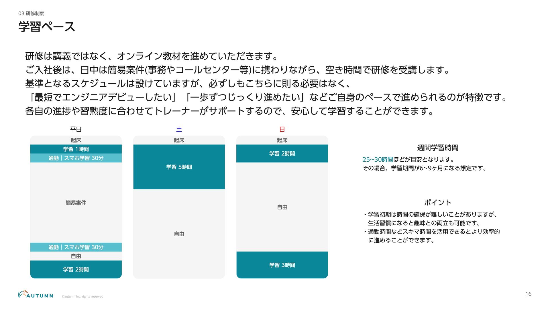 ・リモートワーク可能 (プロジェクトにより異なります) ・交通費補助 エンジニアデビュー前:2万円/月 エンジニアデビュー後:4万円/月 休日休暇 ・完全週休二日制 ・祝日休み ・長期休暇あり 年末年始/夏季休暇/GW (プロジェクトにより異なります) ・産休/育休 その他 ・各種保険完備 雇用保険/労災保険/厚生年金保険/健康保険 ・査定(年4回) 1月/4月/7月/10月 ・決算賞与 ・健康診断 定期イベント ・社員総会&周年記念パーティー 毎年恒例の全社員が集まるイベント ・外部講師勉強会 外部のエンジニアを招いた社内勉強会 ・ マネジ メント 研修 代表の内 山による社内勉強会 ・ オー タムラジ オ 代表の内 山と経営企画の 新山による社内 ラジ オ 完全週休二日制 や各種保険完 備な ど、社員が 安心して働 くことが できる 環境を 整えています 。 また 、定期 的に勉強会 や社内 ラジ オを 実施し、社員が集ま れる 機会を 設けています 。