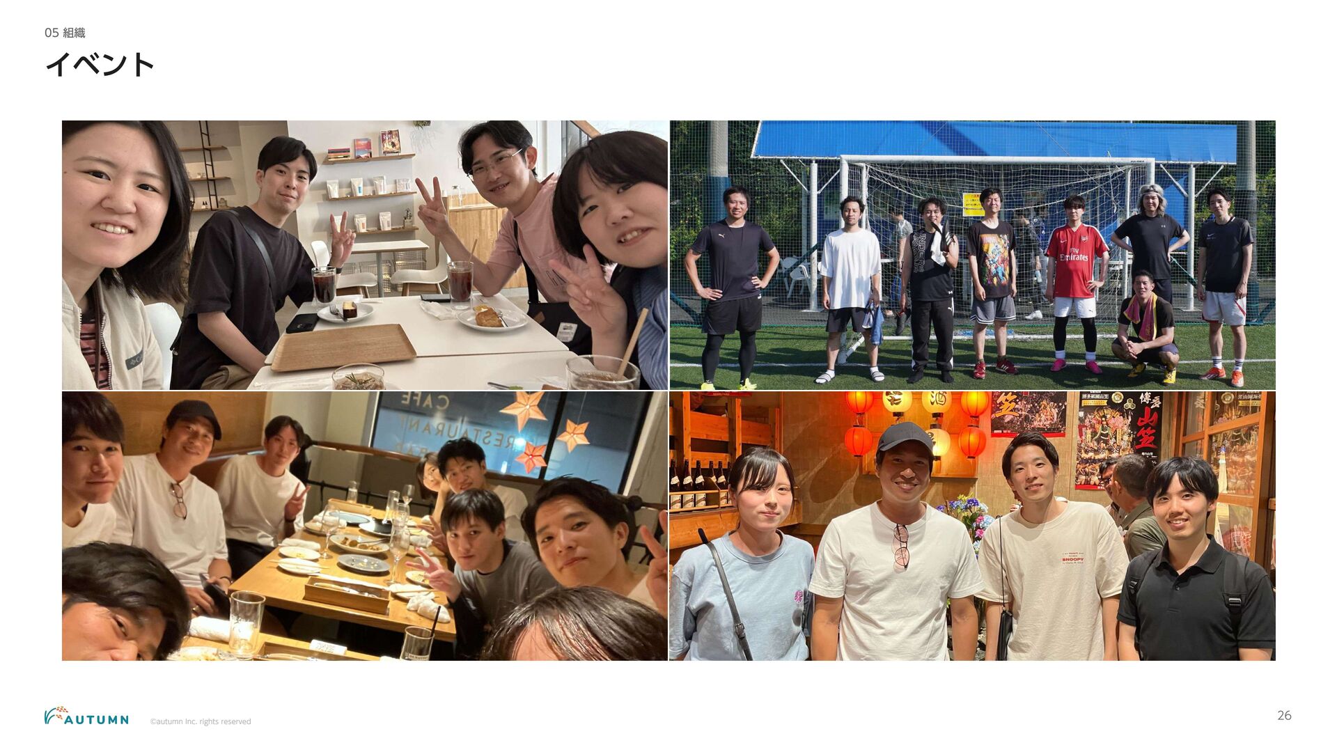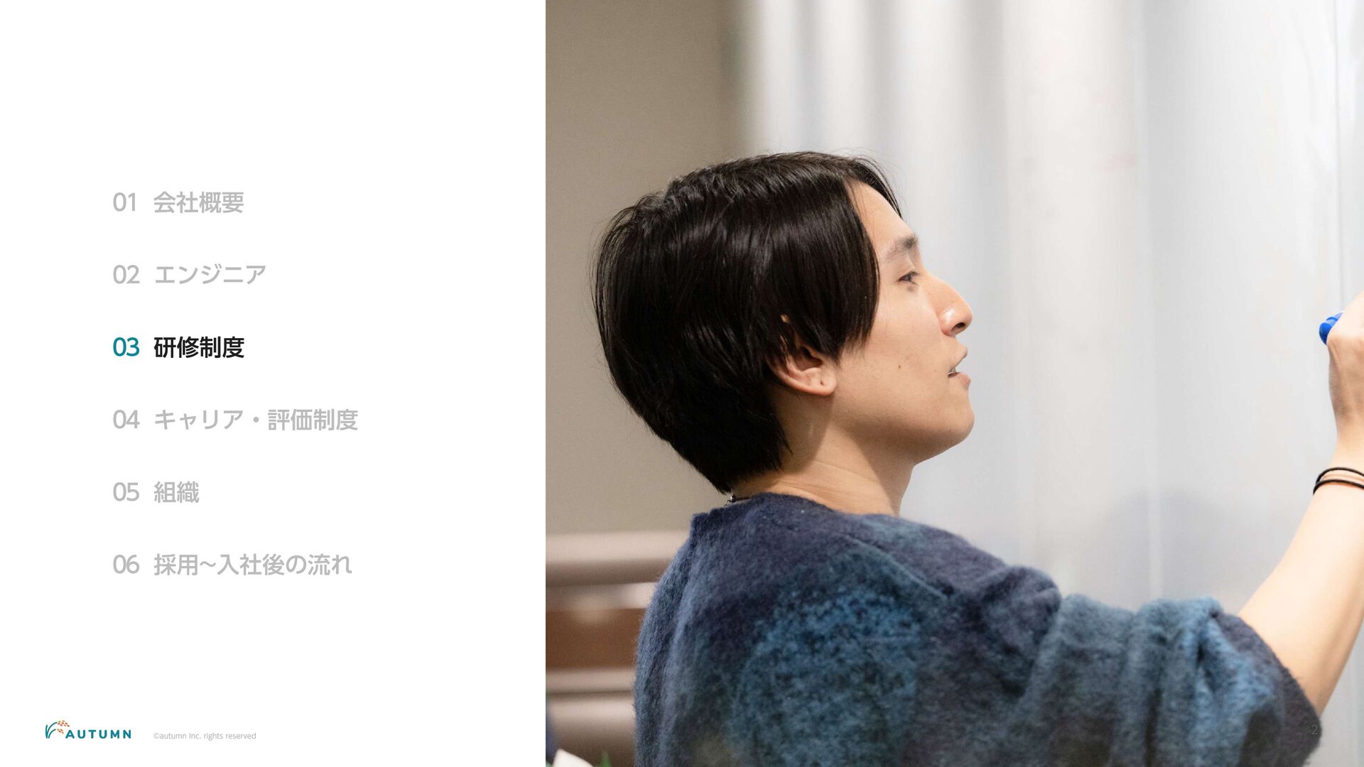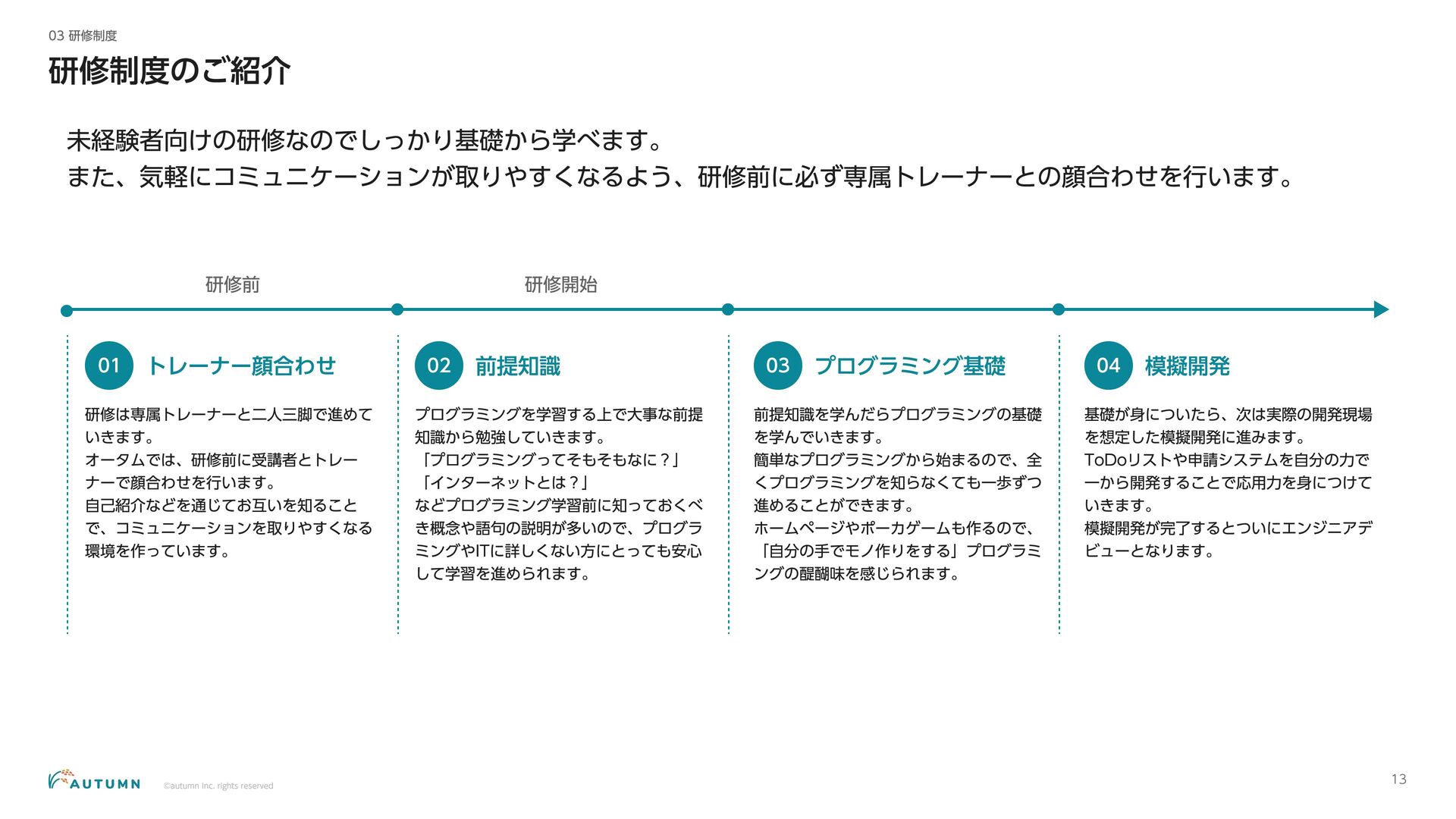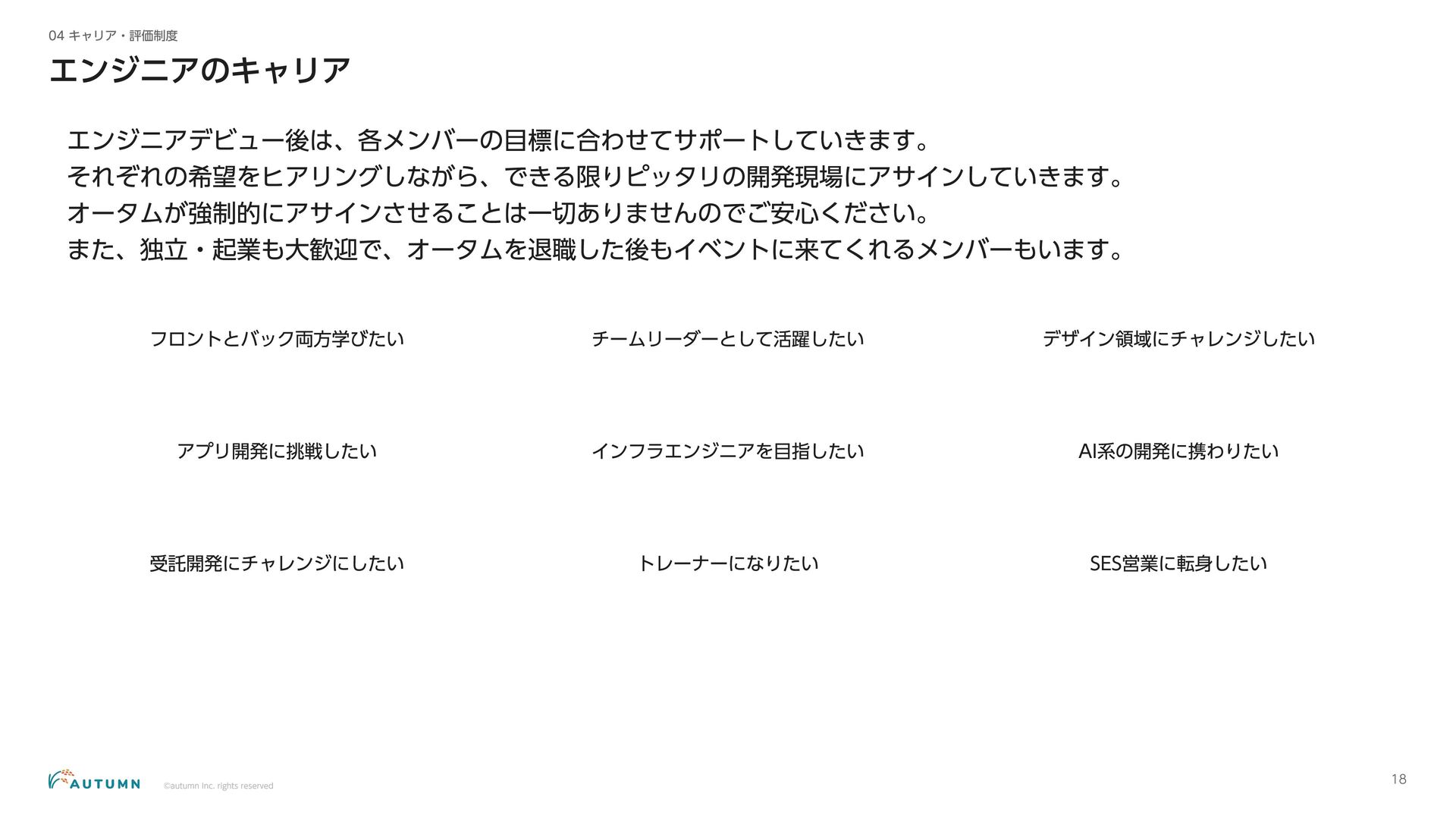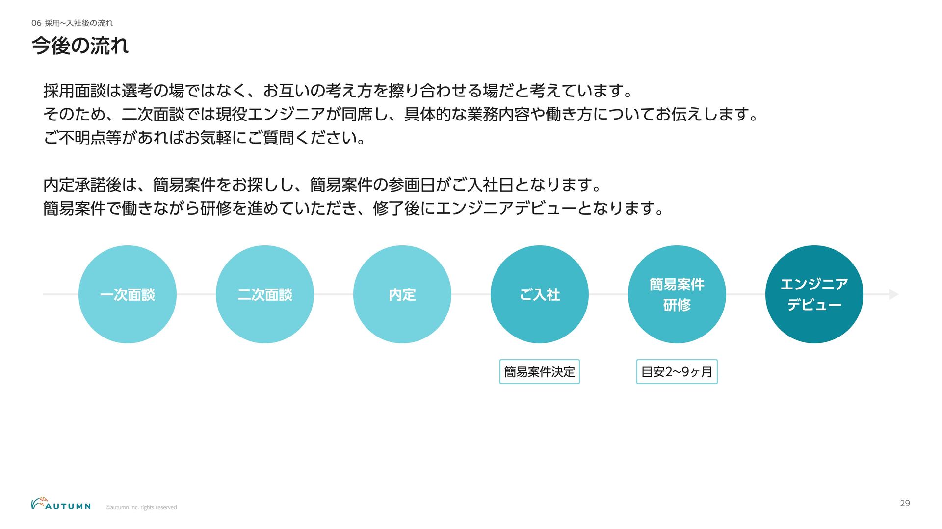 ・リモートワーク可能 (プロジェクトにより異なります) ・交通費補助 エンジニアデビュー前:2万円/月 エンジニアデビュー後:4万円/月 休日休暇 ・完全週休二日制 ・祝日休み ・長期休暇あり 年末年始/夏季休暇/GW (プロジェクトにより異なります) ・産休/育休 その他 ・各種保険完備 雇用保険/労災保険/厚生年金保険/健康保険 ・査定(年4回) 1月/4月/7月/10月 ・決算賞与 ・健康診断 定期イベント ・社員総会&周年記念パーティー 毎年恒例の全社員が集まるイベント ・外部講師勉強会 外部のエンジニアを招いた社内勉強会 ・ マネジ メント 研修 代表の内 山による社内勉強会 ・ オー タムラジ オ 代表の内 山と経営企画の 新山による社内 ラジ オ 完全週休二日制 や各種保険完 備な ど、社員が 安心して働 くことが できる 環境を 整えています 。 また 、定期 的に勉強会 や社内 ラジ オを 実施し、社員が集ま れる 機会を 設けています 。