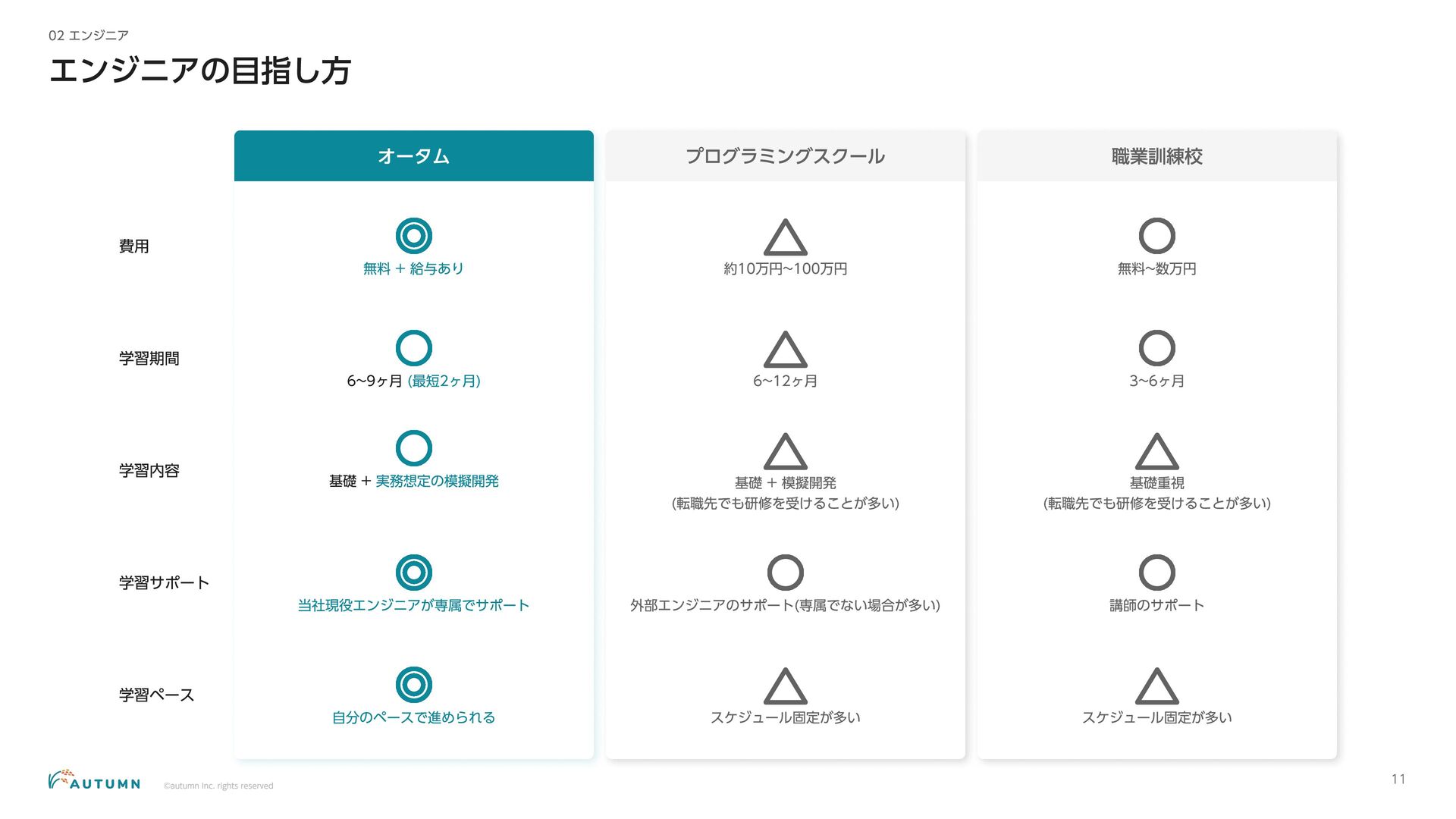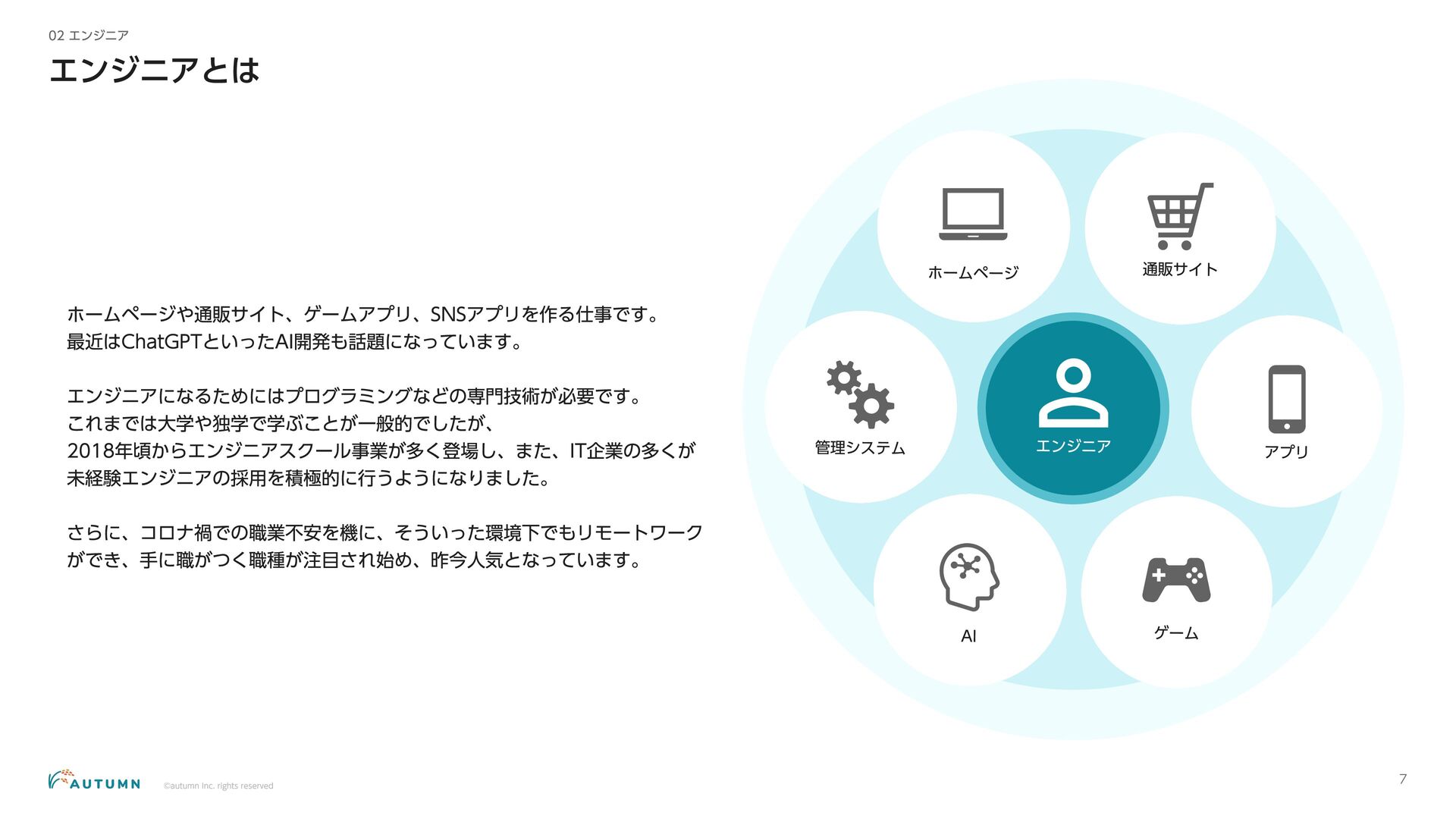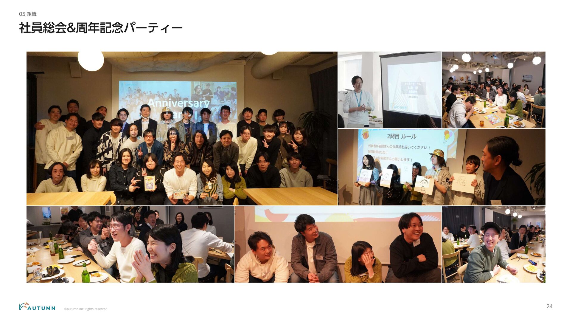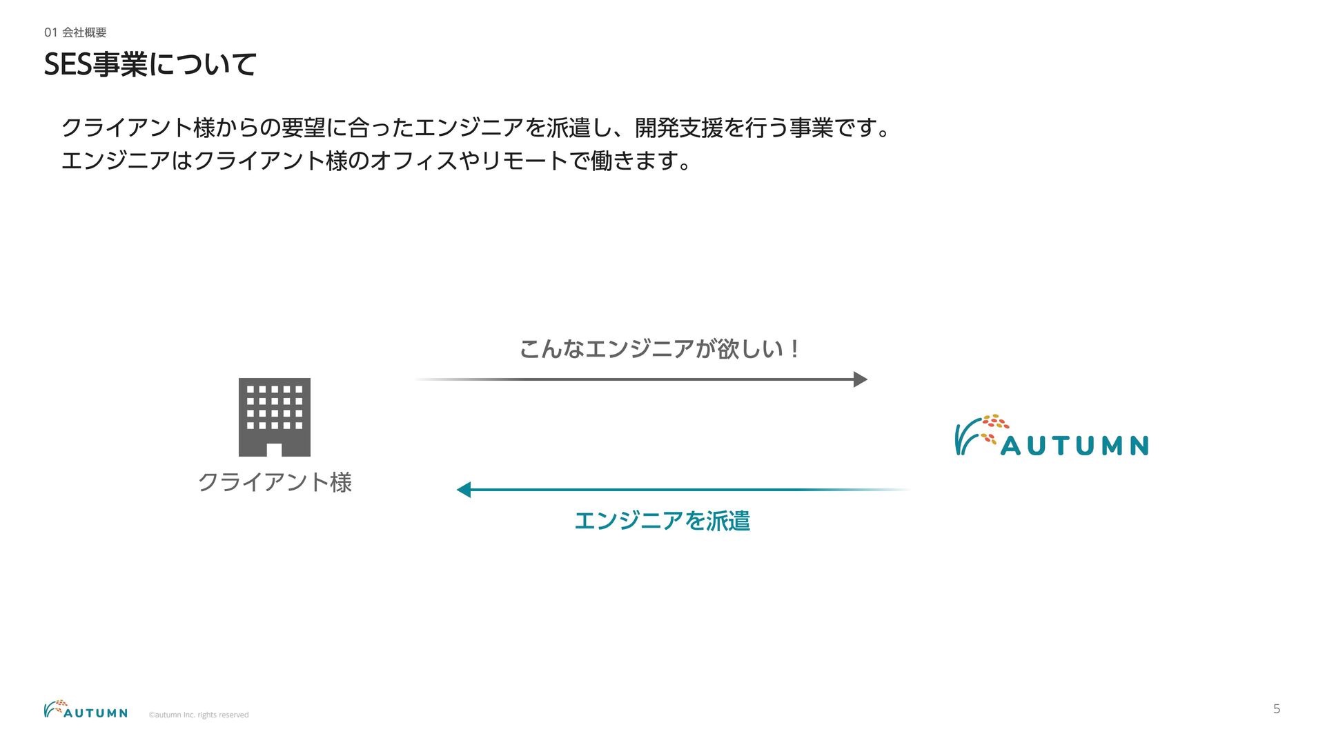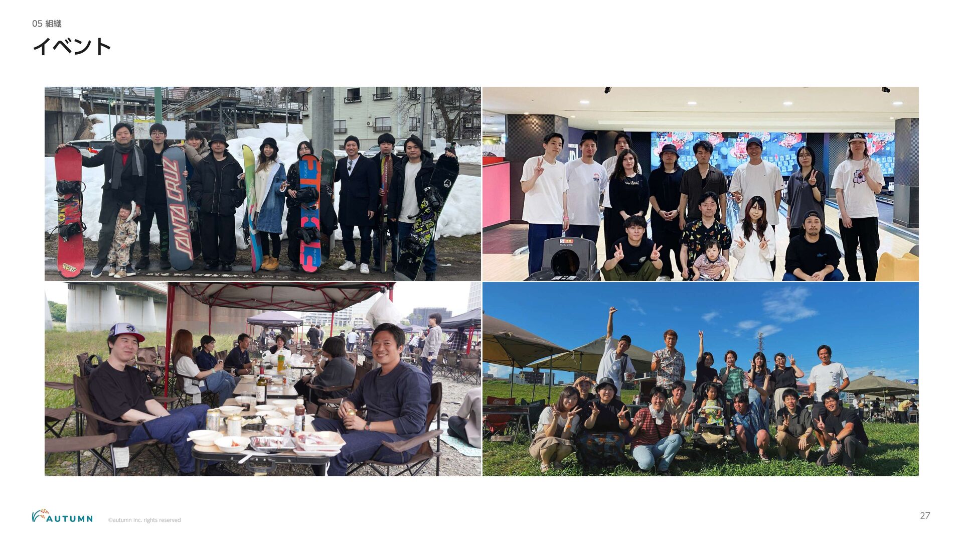 ・リモートワーク可能 (プロジェクトにより異なります) ・交通費補助 エンジニアデビュー前:2万円/月 エンジニアデビュー後:4万円/月 休日休暇 ・完全週休二日制 ・祝日休み ・長期休暇あり 年末年始/夏季休暇/GW (プロジェクトにより異なります) ・産休/育休 その他 ・各種保険完備 雇用保険/労災保険/厚生年金保険/健康保険 ・査定(年4回) 1月/4月/7月/10月 ・決算賞与 ・健康診断 定期イベント ・社員総会&周年記念パーティー 毎年恒例の全社員が集まるイベント ・外部講師勉強会 外部のエンジニアを招いた社内勉強会 ・ マネジ メント 研修 代表の内 山による社内勉強会 ・ オー タムラジ オ 代表の内 山と経営企画の 新山による社内 ラジ オ 完全週休二日制 や各種保険完 備な ど、社員が 安心して働 くことが できる 環境を 整えています 。 また 、定期 的に勉強会 や社内 ラジ オを 実施し、社員が集ま れる 機会を 設けています 。