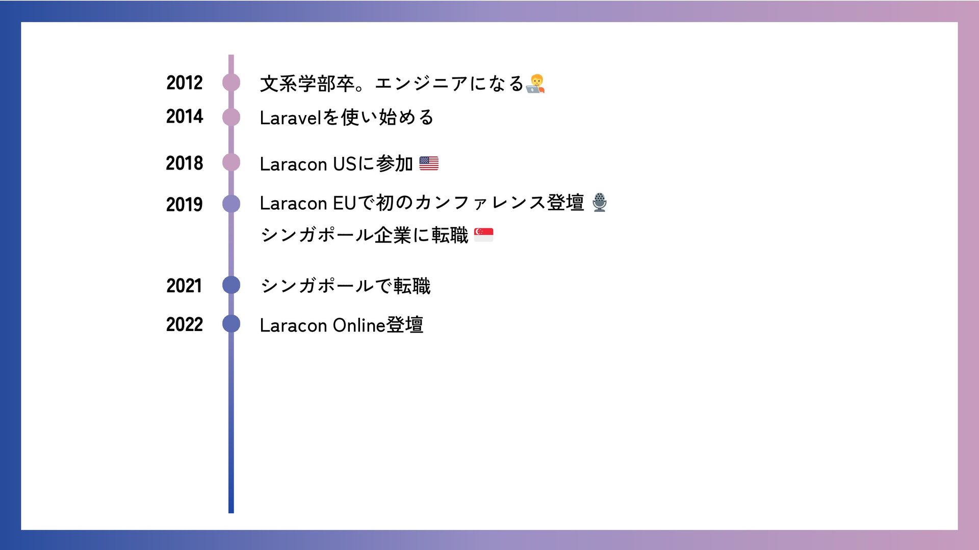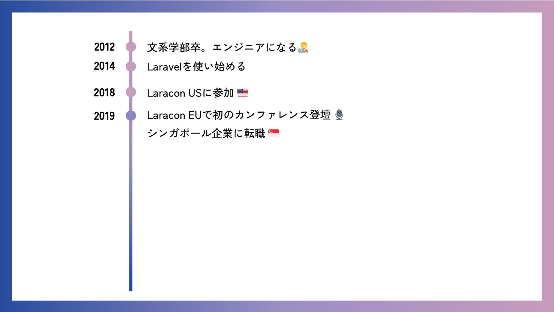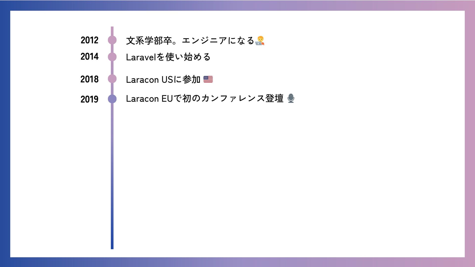 2012 2014 2018 2019 文系学部卒。エンジニアになる 🧑💻 Laravelを使い始める Laracon USに参加 🇺🇸