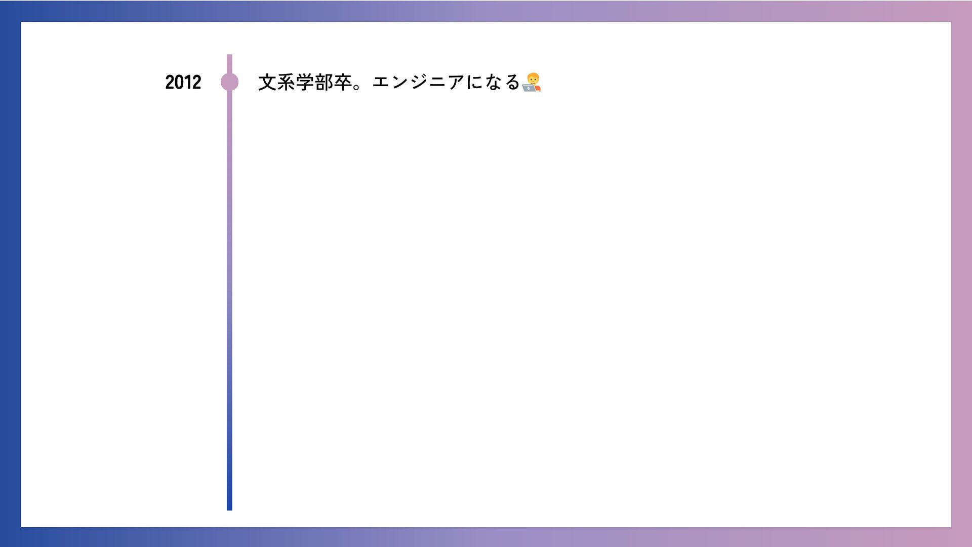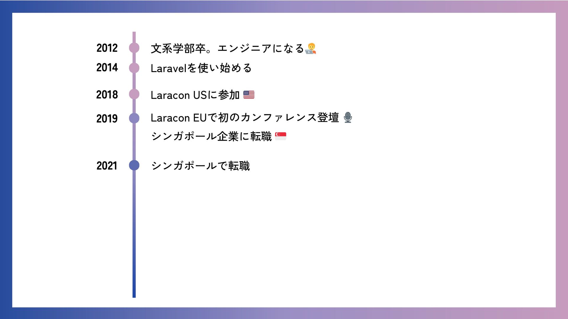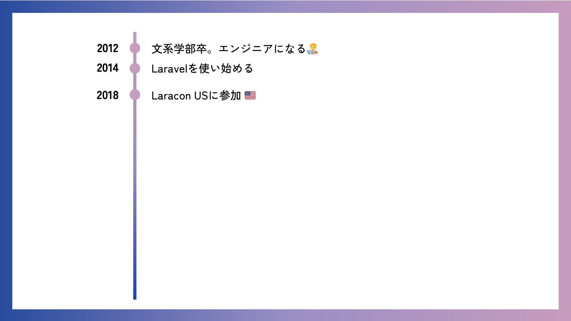 2012 2014 2018 文系学部卒。エンジニアになる 🧑💻 Laravelを使い始める Laracon USに参加 🇺🇸