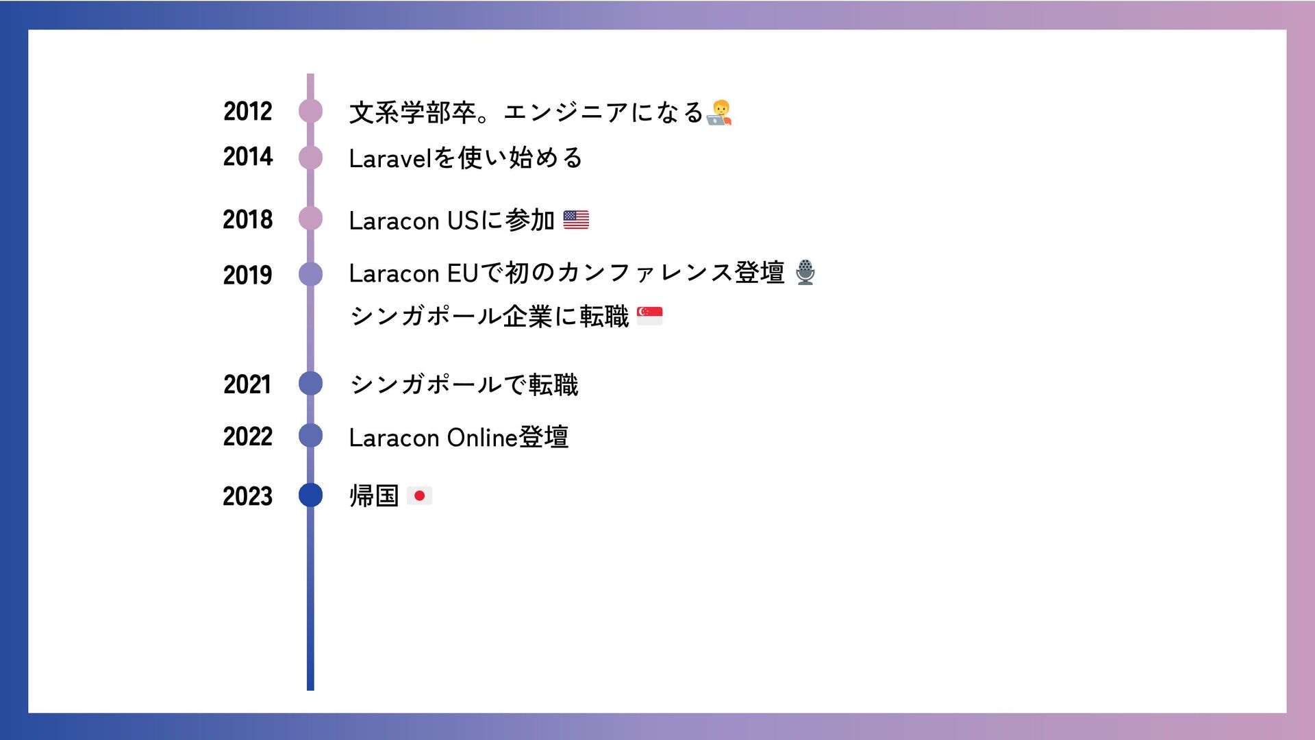 🇺🇸 帰国 🇯🇵 Laracon EUで初のカンファレンス登壇 🎙️ シンガポール企業に転職 🇸🇬 2021 シンガポールで転職 2022 Laracon Online登壇 2023 2025 Laracon India登壇