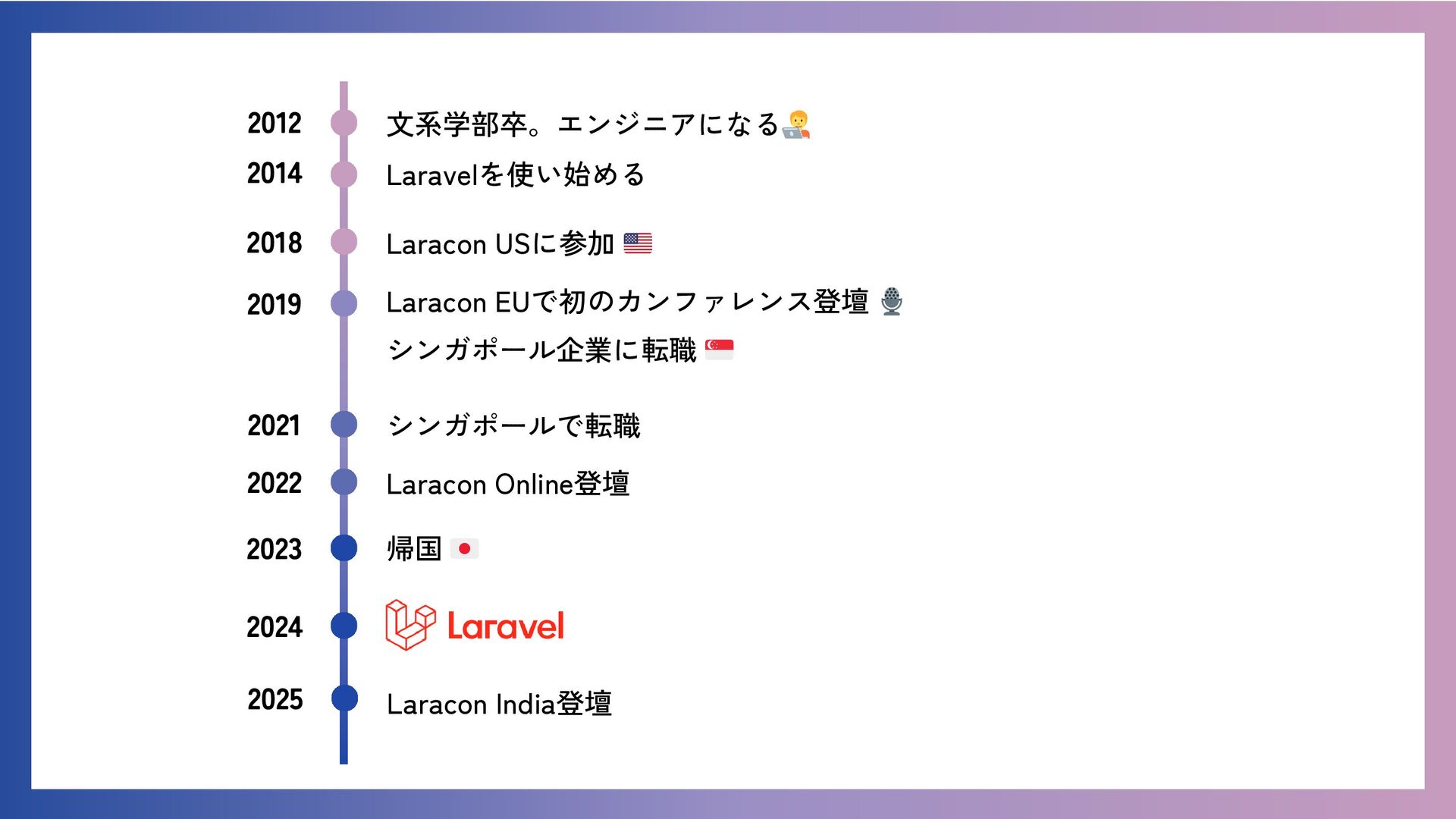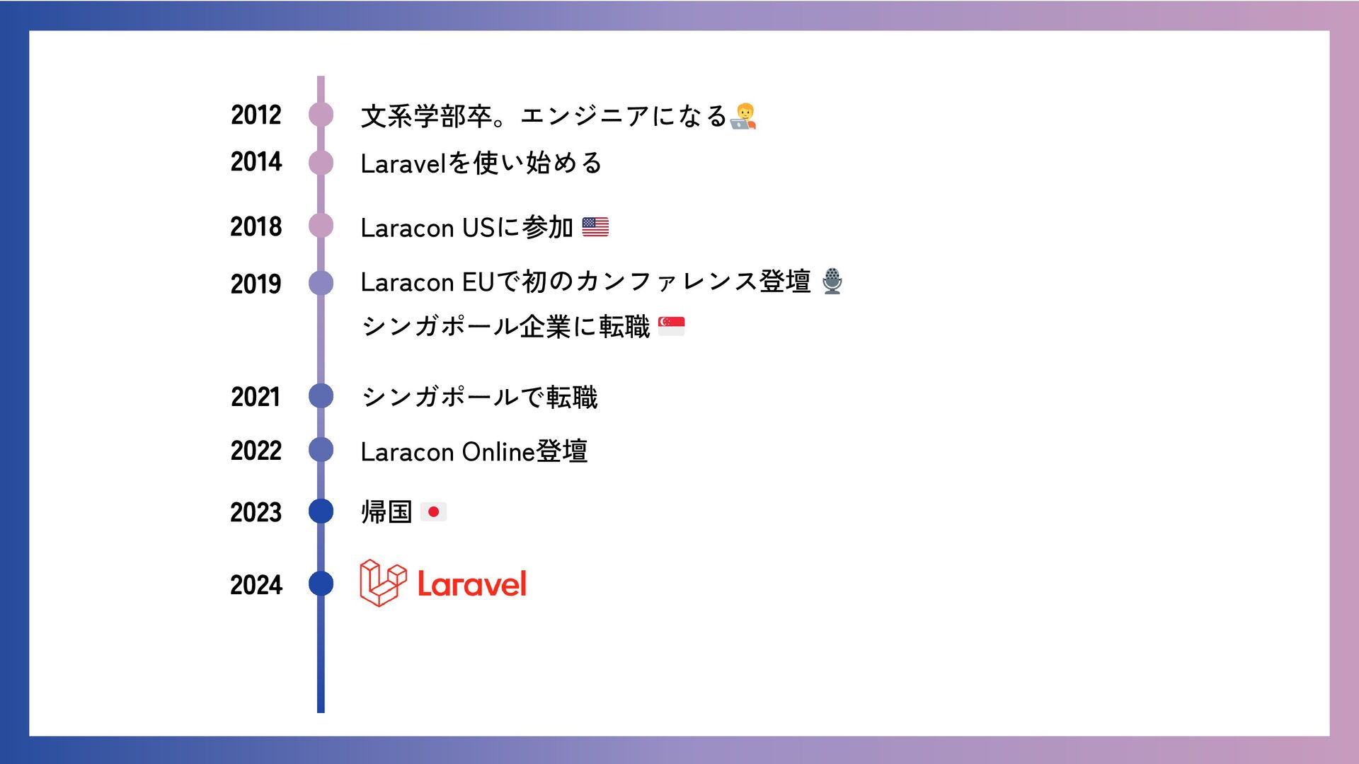 2012 2014 2018 2019 2024 文系学部卒。エンジニアになる 🧑💻 Laravelを使い始める Laracon USに参加