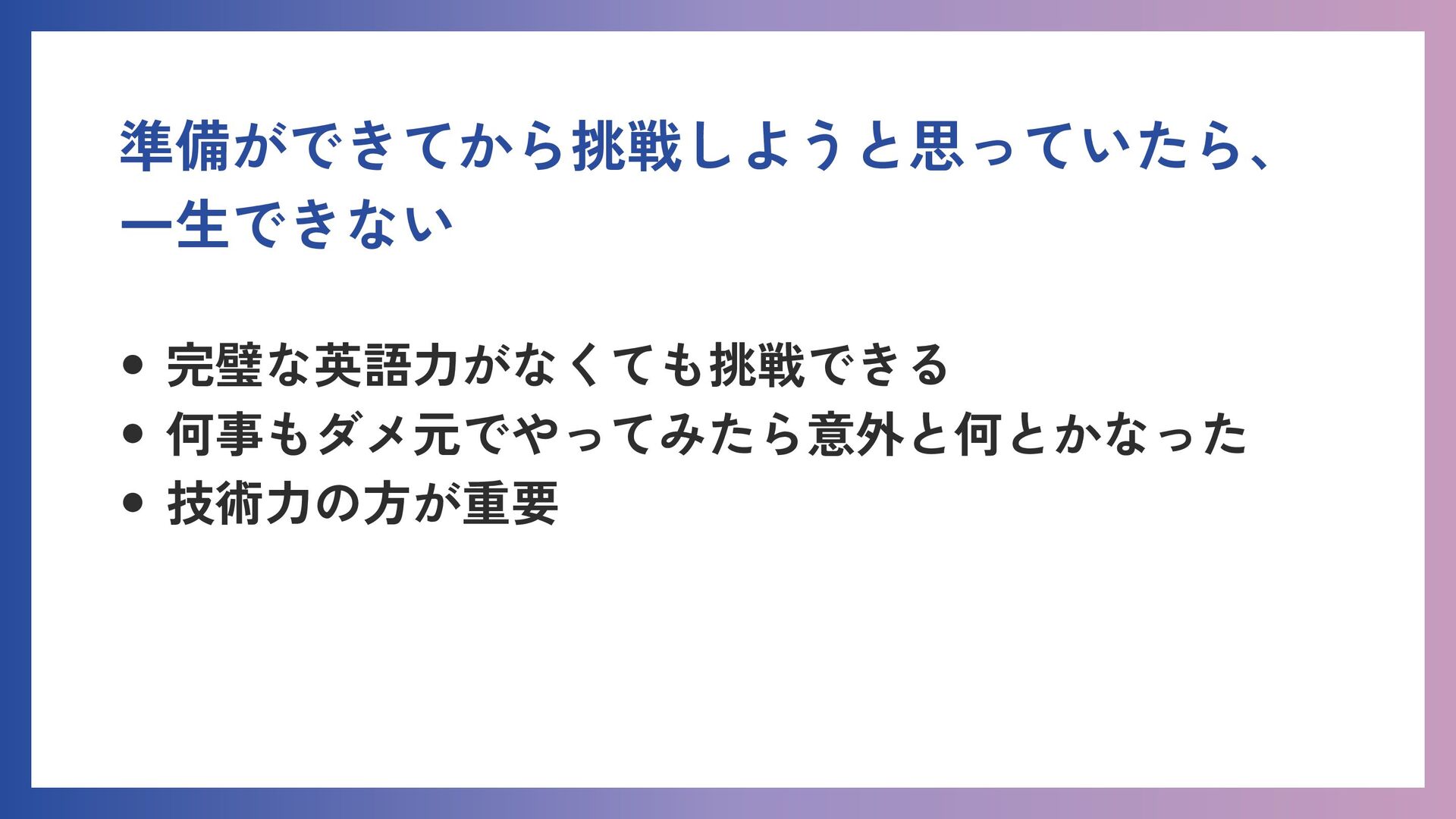 準備ができてから挑戦しようと思っていたら、 一生できない 完璧な英語力がなくても挑戦できる 何事もダメ元でやってみたら意外と何とかなった 技術力の方が重要