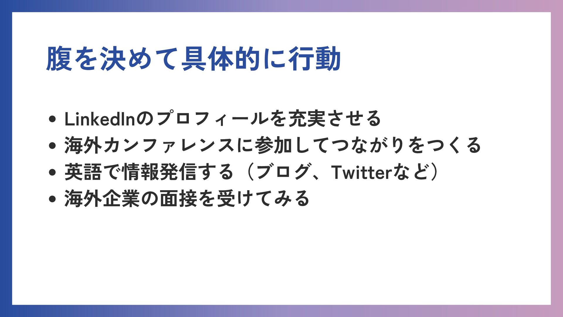 腹を決めて具体的に行動 LinkedInのプロフィールを充実させる 海外カンファレンスに参加してつながりをつくる 英語で情報発信する(ブログ、Twitterなど) 海外企業の面接を受けてみる