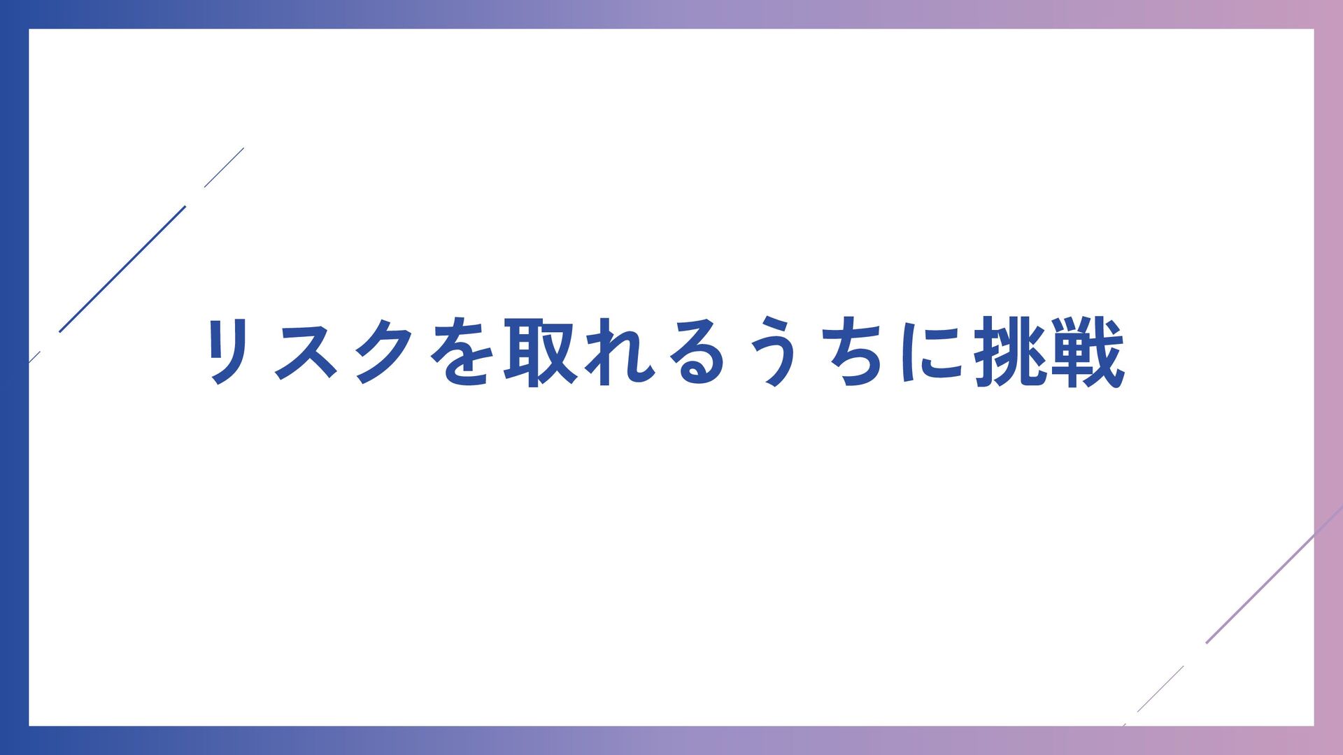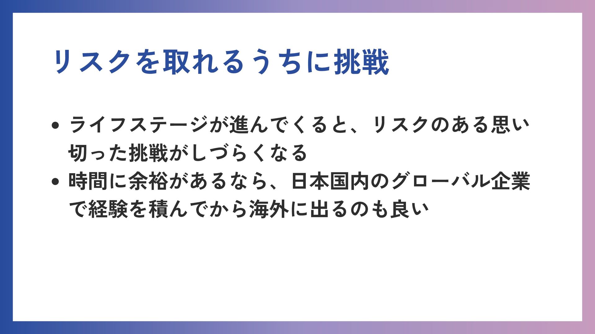 リスクを取れるうちに挑戦 ライフステージが進んでくると、リスクのある思い 切った挑戦がしづらくなる 時間に余裕があるなら、日本国内のグローバル企業 で経験を積んでから海外に出るのも良い