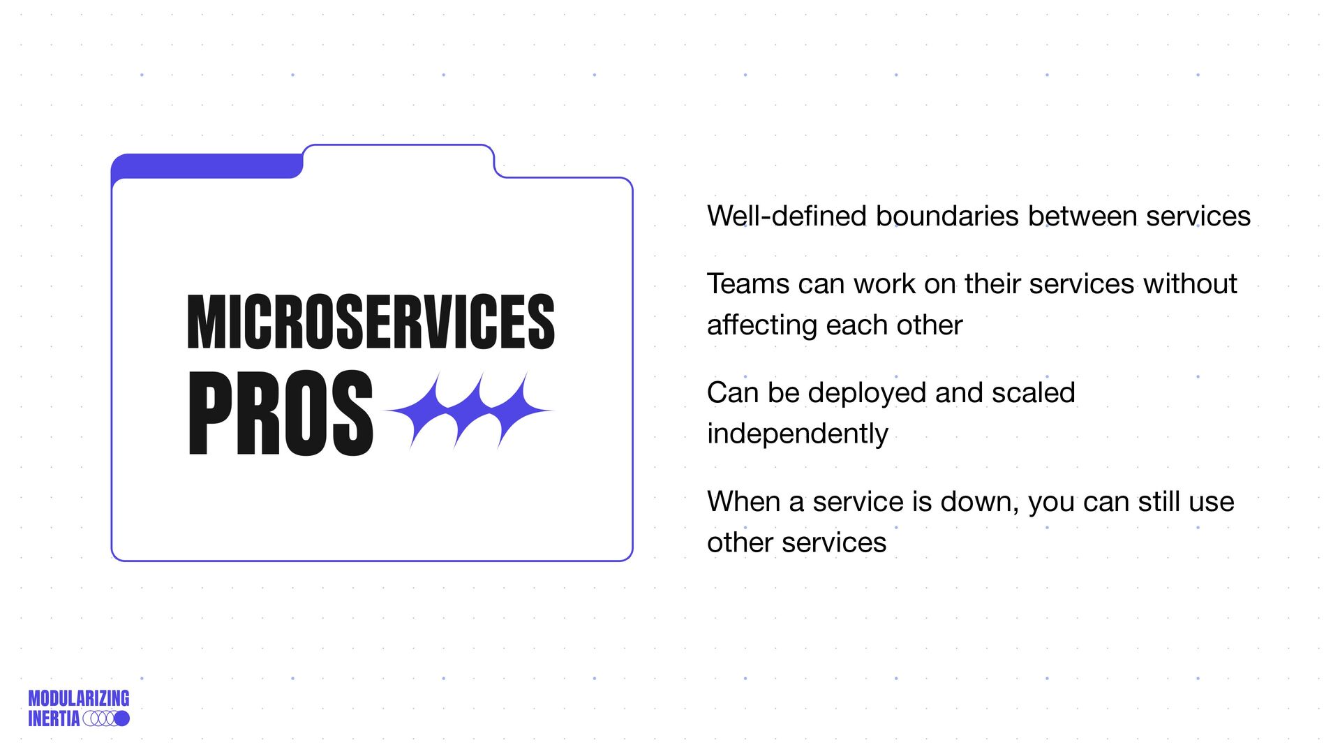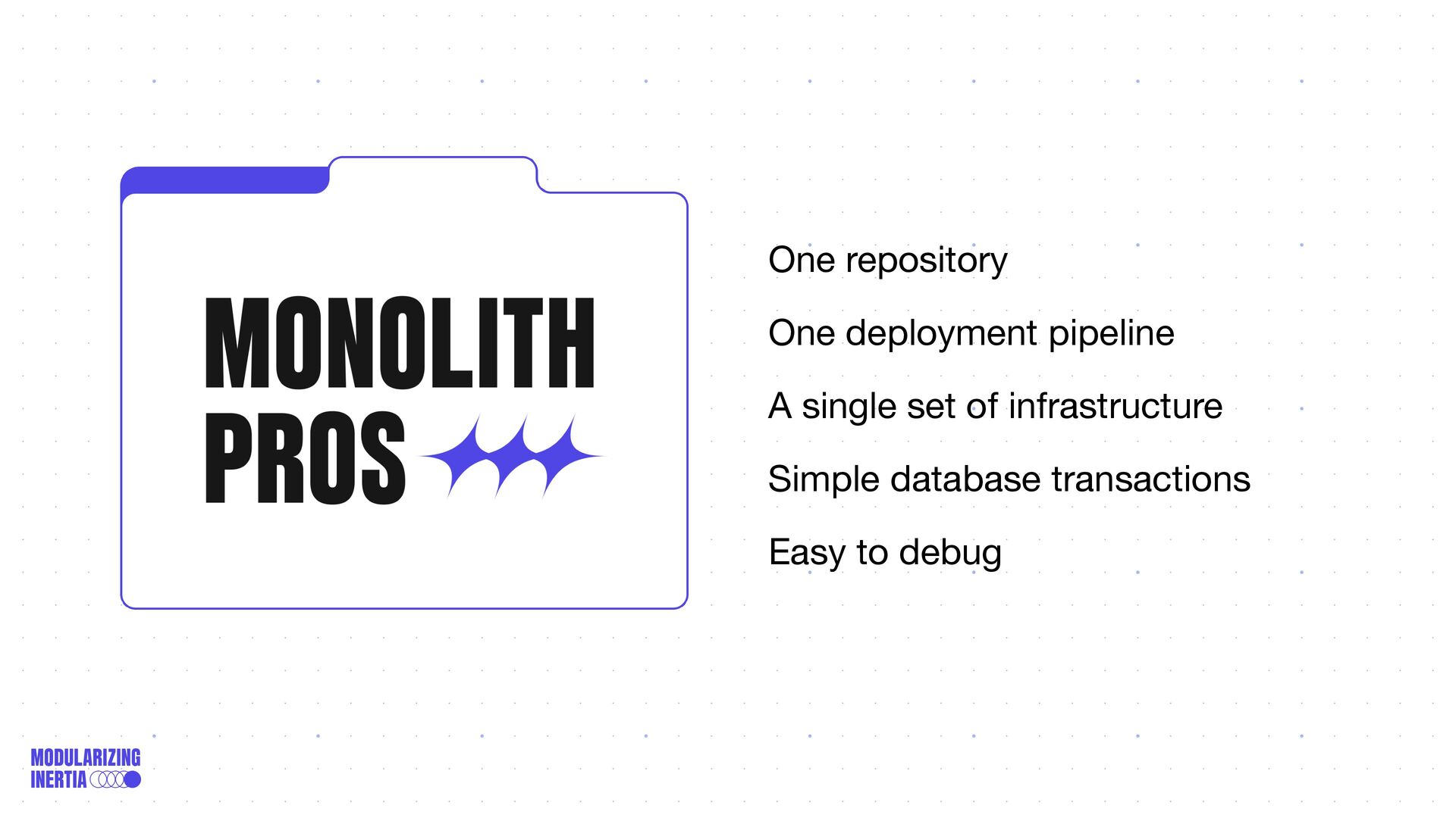 As your product and team grow, you might reach a point where scaling a monolithic application is challenging due to different functionalities being tightly coupled in the same codebase with no boundaries.