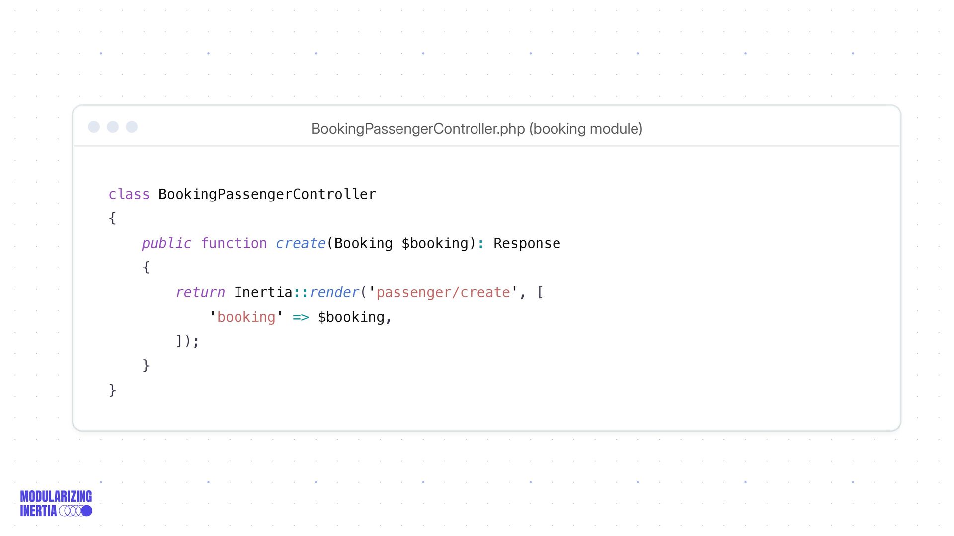 Inertia::render('passenger/create', [ 'booking' => $booking, ]); } } BookingPassengerController.php (booking module)