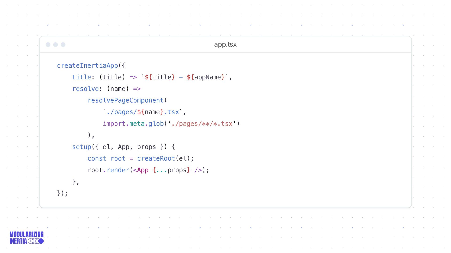 5. app.tsx createInertiaApp({ title: (title) => `${title} - ${appName}`, resolve: (name)
