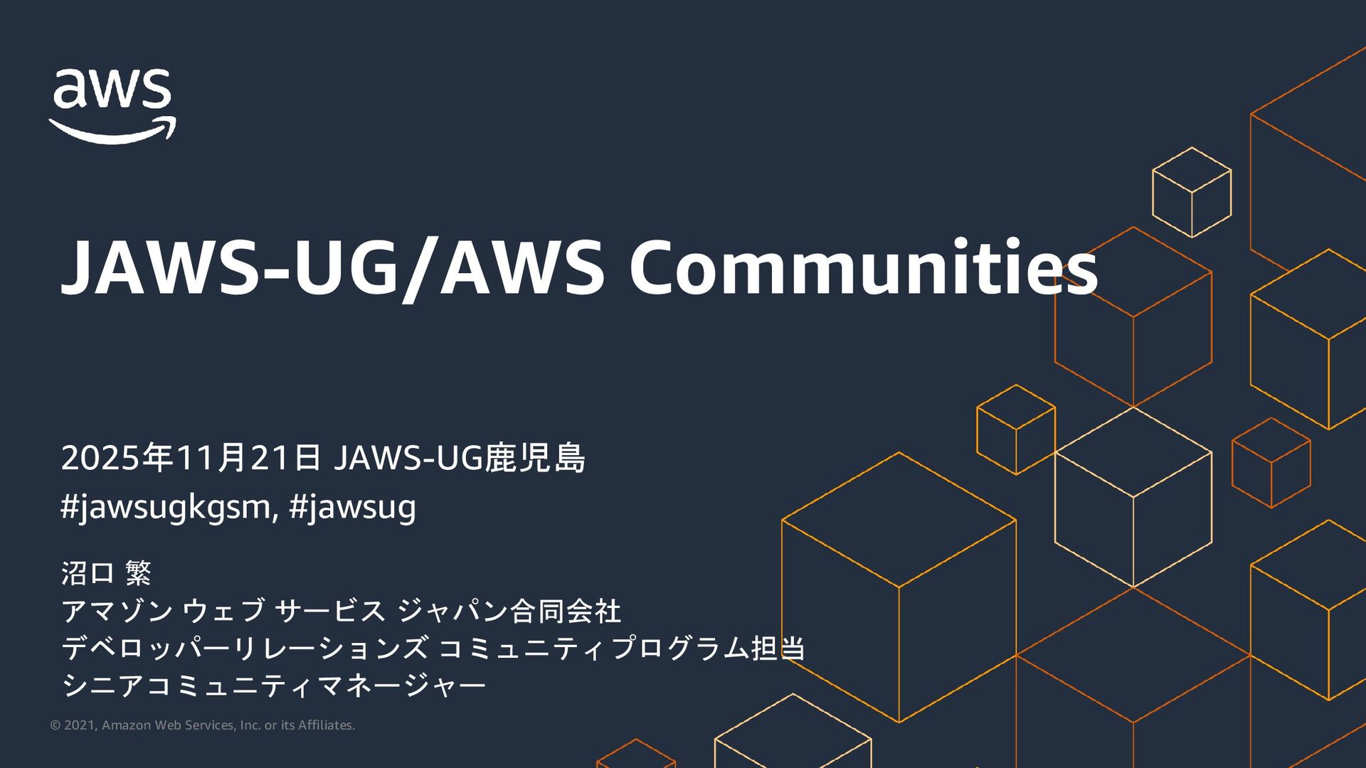 繁 アマゾン ウェブ サービス ジャパン合同会社 デベロッパーリレーションズ コミュニティプログラム担当 シニアコミュニティマネージャー JAWS-UG/AWS Communities 2025年11月21日 JAWS-UG鹿児島 #jawsugkgsm, #jawsug