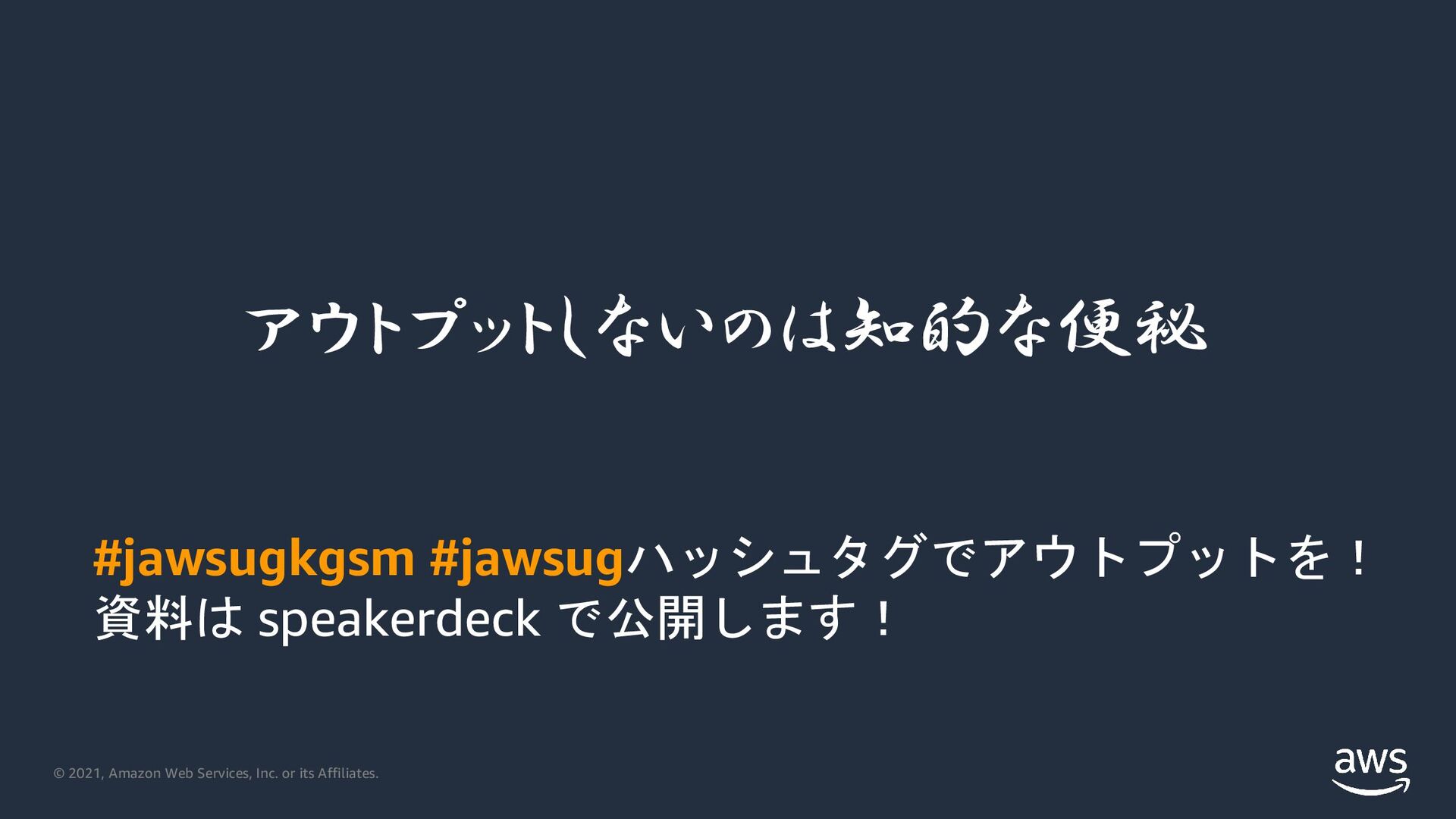 2021, Amazon Web Services, Inc. or its Affiliates. アウトプットしないのは知的な便秘 #jawsugkgsm #jawsugハッシュタグでアウトプットを! 資料は speakerdeck で公開します!
