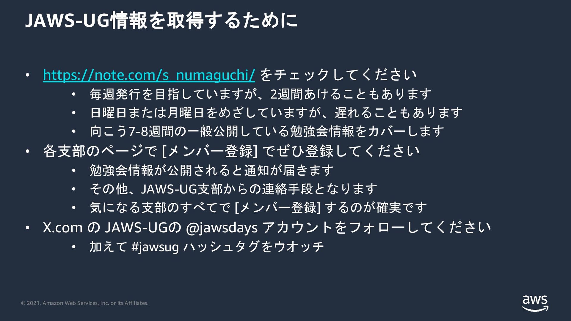 © 2021, Amazon Web Services, Inc. or its Affiliates. JAWS-UG情報を取得するために