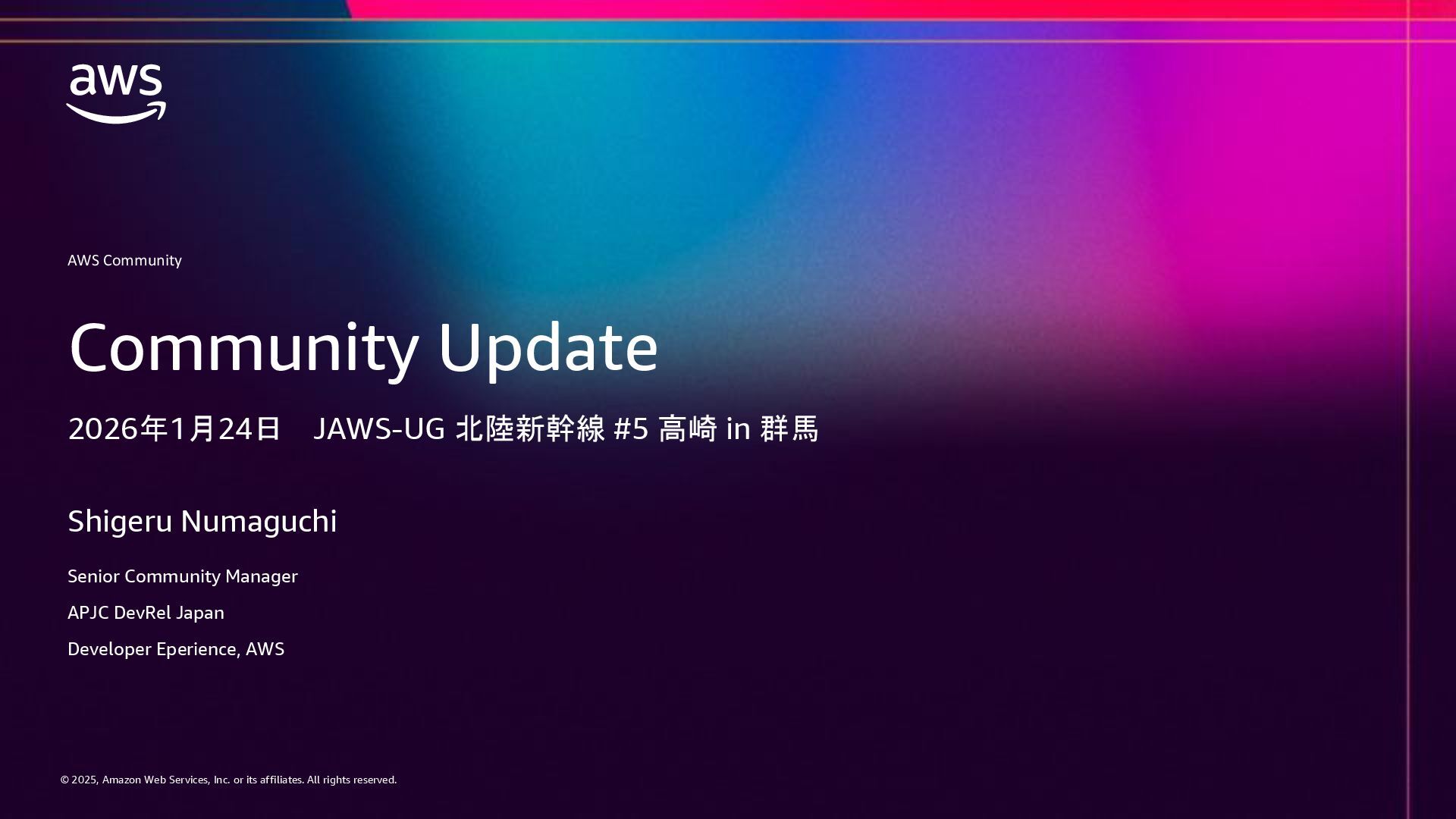 rights reserved. © 2025, Amazon Web Services, Inc. or its affiliates. All rights reserved. AWS Community Shigeru Numaguchi Senior Community Manager APJC DevRel Japan Developer Eperience, AWS Community Update 2026年1月24日 JAWS-UG 北陸新幹線 #5 高崎 in 群馬