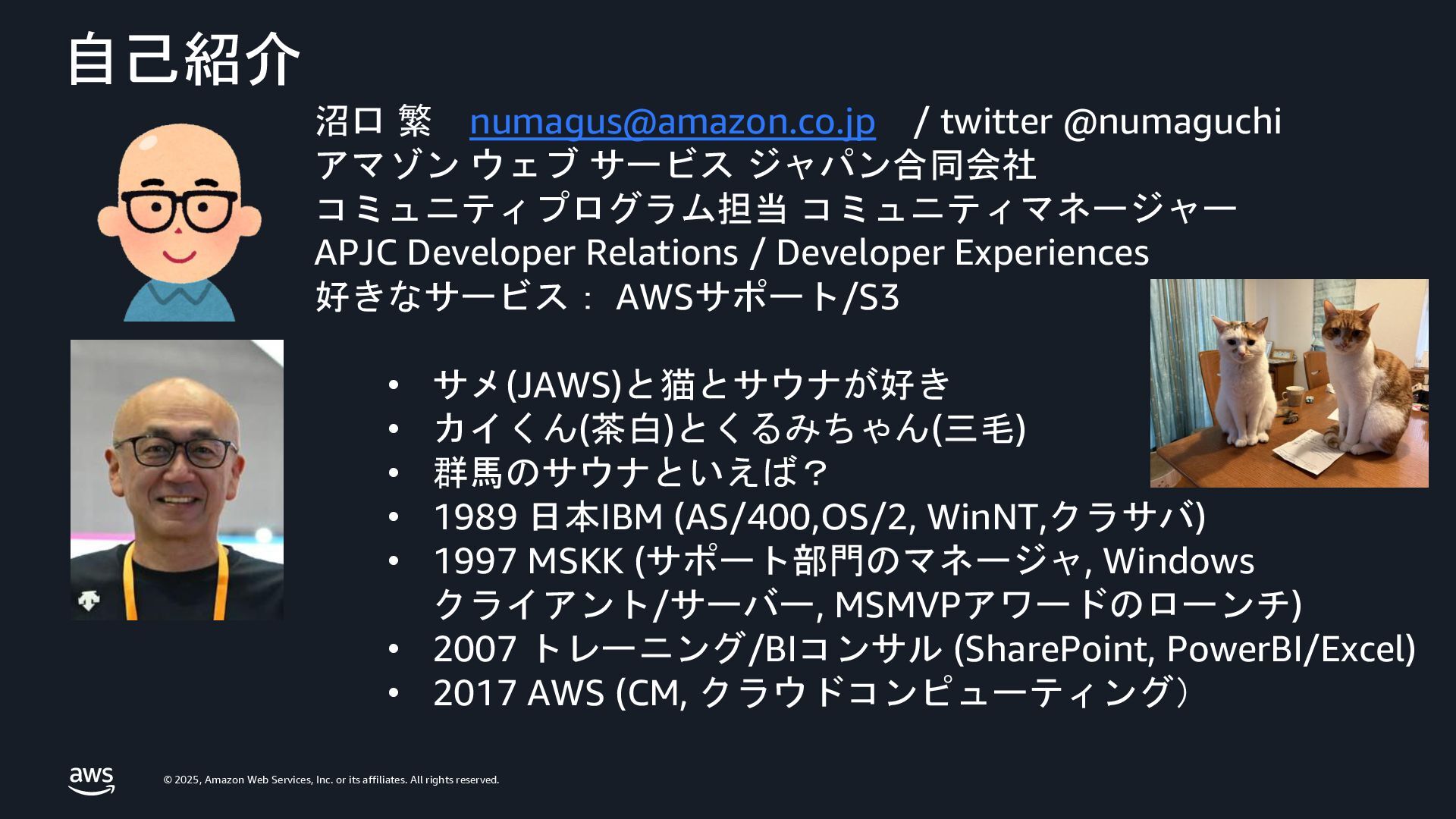 rights reserved. 自己紹介 沼口 繁 [email protected] / twitter @numaguchi アマゾン ウェブ サービス ジャパン合同会社 コミュニティプログラム担当 コミュニティマネージャー APJC Developer Relations / Developer Experiences 好きなサービス: AWSサポート/S3 • サメ(JAWS)と猫とサウナが好き • カイくん(茶白)とくるみちゃん(三毛) • 群馬のサウナといえば? • 1989 日本IBM (AS/400,OS/2, WinNT,クラサバ) • 1997 MSKK (サポート部門のマネージャ, Windows クライアント/サーバー, MSMVPアワードのローンチ) • 2007 トレーニング/BIコンサル (SharePoint, PowerBI/Excel) • 2017 AWS (CM, クラウドコンピューティング)