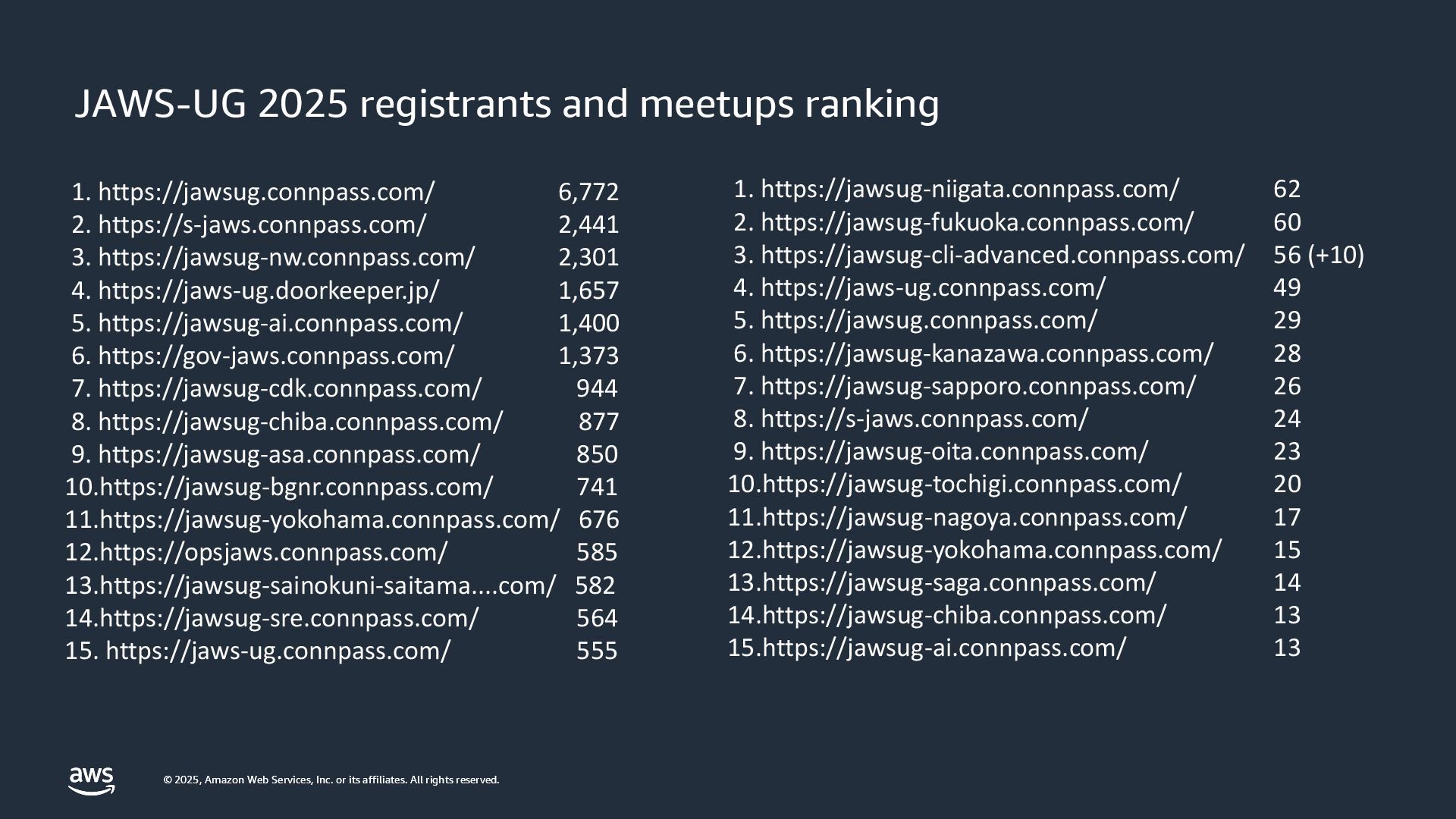 rights reserved. © 2025, Amazon Web Services, Inc. or its affiliates. All rights reserved. 1. https://jawsug.connpass.com/ 6,772 2. https://s-jaws.connpass.com/ 2,441 3. https://jawsug-nw.connpass.com/ 2,301 4. https://jaws-ug.doorkeeper.jp/ 1,657 5. https://jawsug-ai.connpass.com/ 1,400 6. https://gov-jaws.connpass.com/ 1,373 7. https://jawsug-cdk.connpass.com/ 944 8. https://jawsug-chiba.connpass.com/ 877 9. https://jawsug-asa.connpass.com/ 850 10.https://jawsug-bgnr.connpass.com/ 741 11.https://jawsug-yokohama.connpass.com/ 676 12.https://opsjaws.connpass.com/ 585 13.https://jawsug-sainokuni-saitama....com/ 582 14.https://jawsug-sre.connpass.com/ 564 15. https://jaws-ug.connpass.com/ 555 1. https://jawsug-niigata.connpass.com/ 62 2. https://jawsug-fukuoka.connpass.com/ 60 3. https://jawsug-cli-advanced.connpass.com/ 56 (+10) 4. https://jaws-ug.connpass.com/ 49 5. https://jawsug.connpass.com/ 29 6. https://jawsug-kanazawa.connpass.com/ 28 7. https://jawsug-sapporo.connpass.com/ 26 8. https://s-jaws.connpass.com/ 24 9. https://jawsug-oita.connpass.com/ 23 10.https://jawsug-tochigi.connpass.com/ 20 11.https://jawsug-nagoya.connpass.com/ 17 12.https://jawsug-yokohama.connpass.com/ 15 13.https://jawsug-saga.connpass.com/ 14 14.https://jawsug-chiba.connpass.com/ 13 15.https://jawsug-ai.connpass.com/ 13 JAWS-UG 2025 registrants and meetups ranking