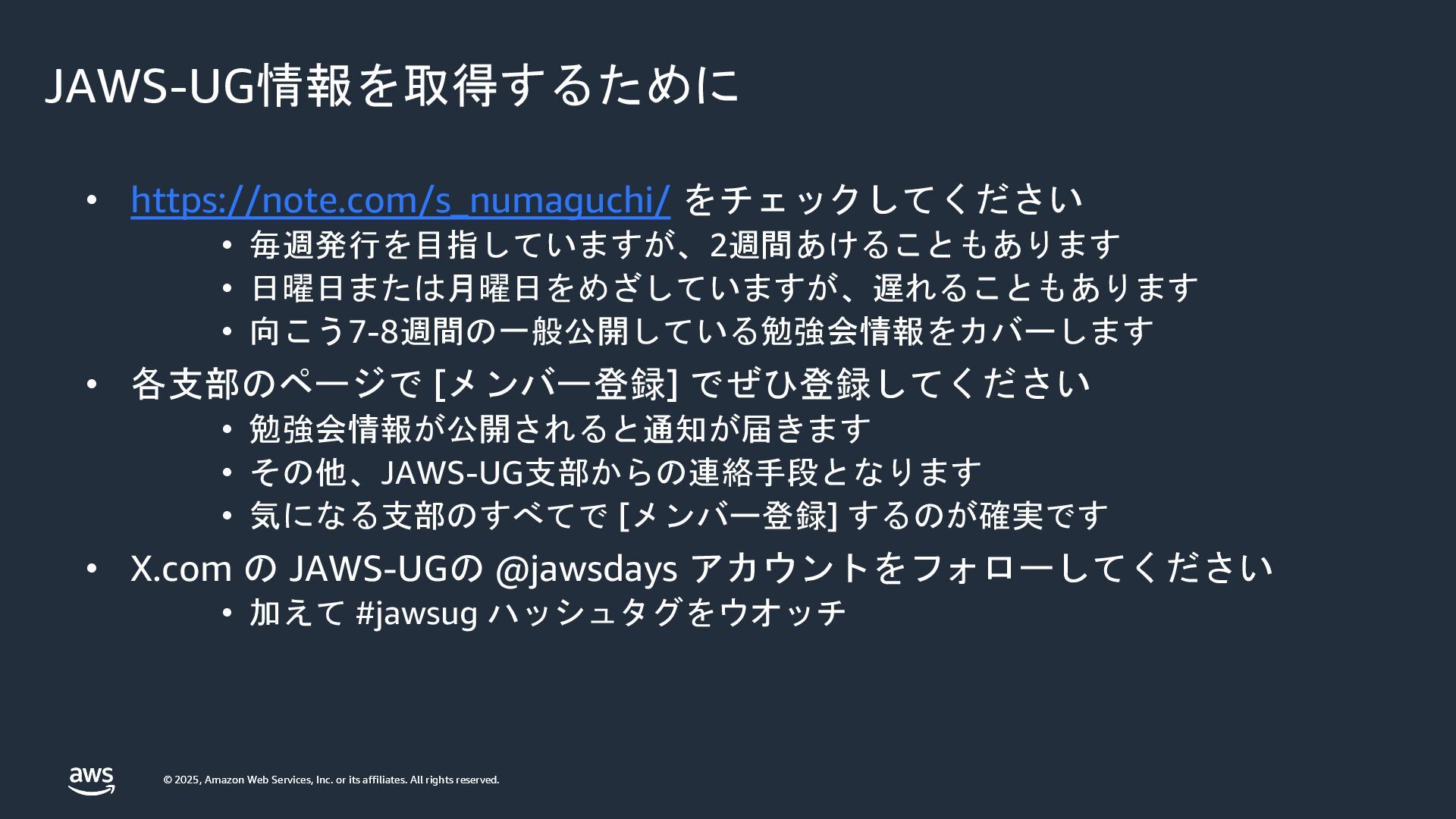 rights reserved. © 2025, Amazon Web Services, Inc. or its affiliates. All rights reserved. JAWS-UG情報を取得するために • https://note.com/s_numaguchi/ をチェックしてください • 毎週発行を目指していますが、2週間あけることもあります • 日曜日または月曜日をめざしていますが、遅れることもあります • 向こう7-8週間の一般公開している勉強会情報をカバーします • 各支部のページで [メンバー登録] でぜひ登録してください • 勉強会情報が公開されると通知が届きます • その他、JAWS-UG支部からの連絡手段となります • 気になる支部のすべてで [メンバー登録] するのが確実です • X.com の JAWS-UGの @jawsdays アカウントをフォローしてください • 加えて #jawsug ハッシュタグをウオッチ
