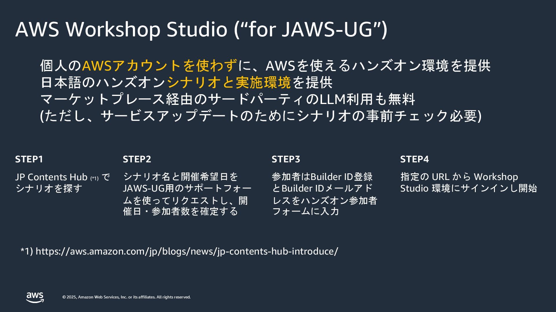 rights reserved. © 2025, Amazon Web Services, Inc. or its affiliates. All rights reserved. AWS Workshop Studio (“for JAWS-UG”) 個人のAWSアカウントを使わずに、AWSを使えるハンズオン環境を提供 日本語のハンズオンシナリオと実施環境を提供 マーケットプレース経由のサードパーティのLLM利用も無料 (ただし、サービスアップデートのためにシナリオの事前チェック必要) STEP1 JP Contents Hub (*1) で シナリオを探す *1) https://aws.amazon.com/jp/blogs/news/jp-contents-hub-introduce/ STEP2 シナリオ名と開催希望日を JAWS-UG用のサポートフォー ムを使ってリクエストし、開 催日・参加者数を確定する STEP3 参加者はBuilder ID登録 とBuilder IDメールアド レスをハンズオン参加者 フォームに入力 STEP4 指定の URL から Workshop Studio 環境にサインインし開始