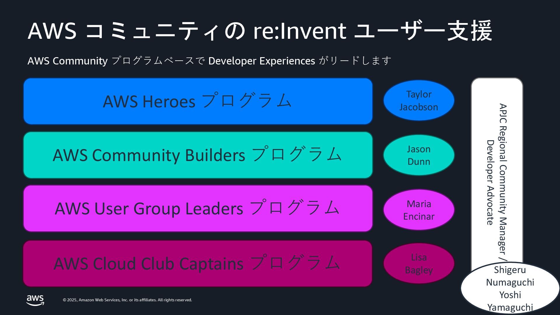 rights reserved. AWS コミュニティの re:Invent ユーザー支援 AWS Community プログラムベースで Developer Experiences がリードします AWS Heroes プログラム AWS Community Builders プログラム AWS User Group Leaders プログラム AWS Cloud Club Captains プログラム Taylor Jacobson Jason Dunn Maria Encinar Lisa Bagley APJC Regional Community Manager / Developer Advocate Shigeru Numaguchi Yoshi Yamaguchi