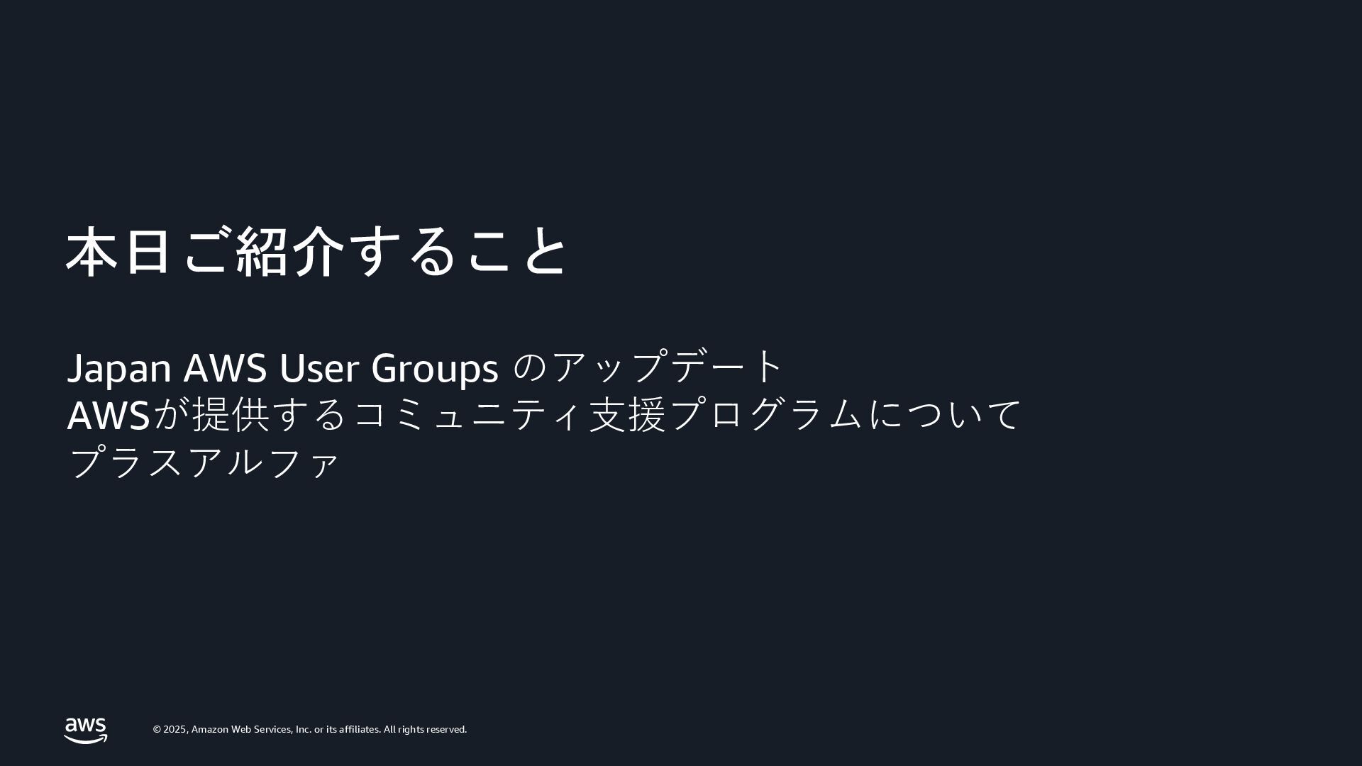 rights reserved. Japan AWS User Groups のアップデート AWSが提供するコミュニティ支援プログラムについて プラスアルファ 本日ご紹介すること