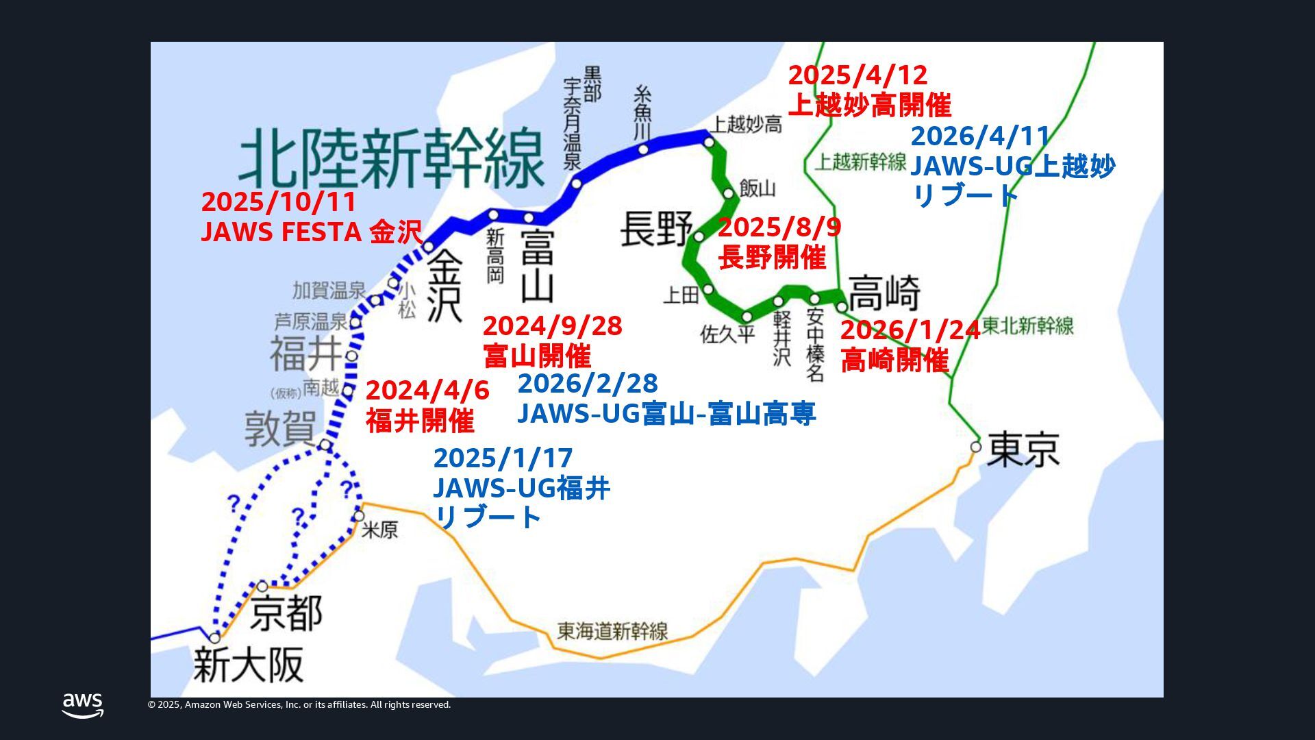 rights reserved. JAWS-UG 北陸新幹線 シリーズ 群馬開催おめでとうございます!!! 2024/4/6 福井開催 2024/9/28 富山開催 2025/4/12 上越妙高開催 2025/8/9 長野開催 2026/1/24 高崎開催 2025/10/11 JAWS FESTA 金沢 2025/1/17 JAWS-UG福井 リブート 2026/4/11 JAWS-UG上越妙 リブート 2026/2/28 JAWS-UG富山-富山高専