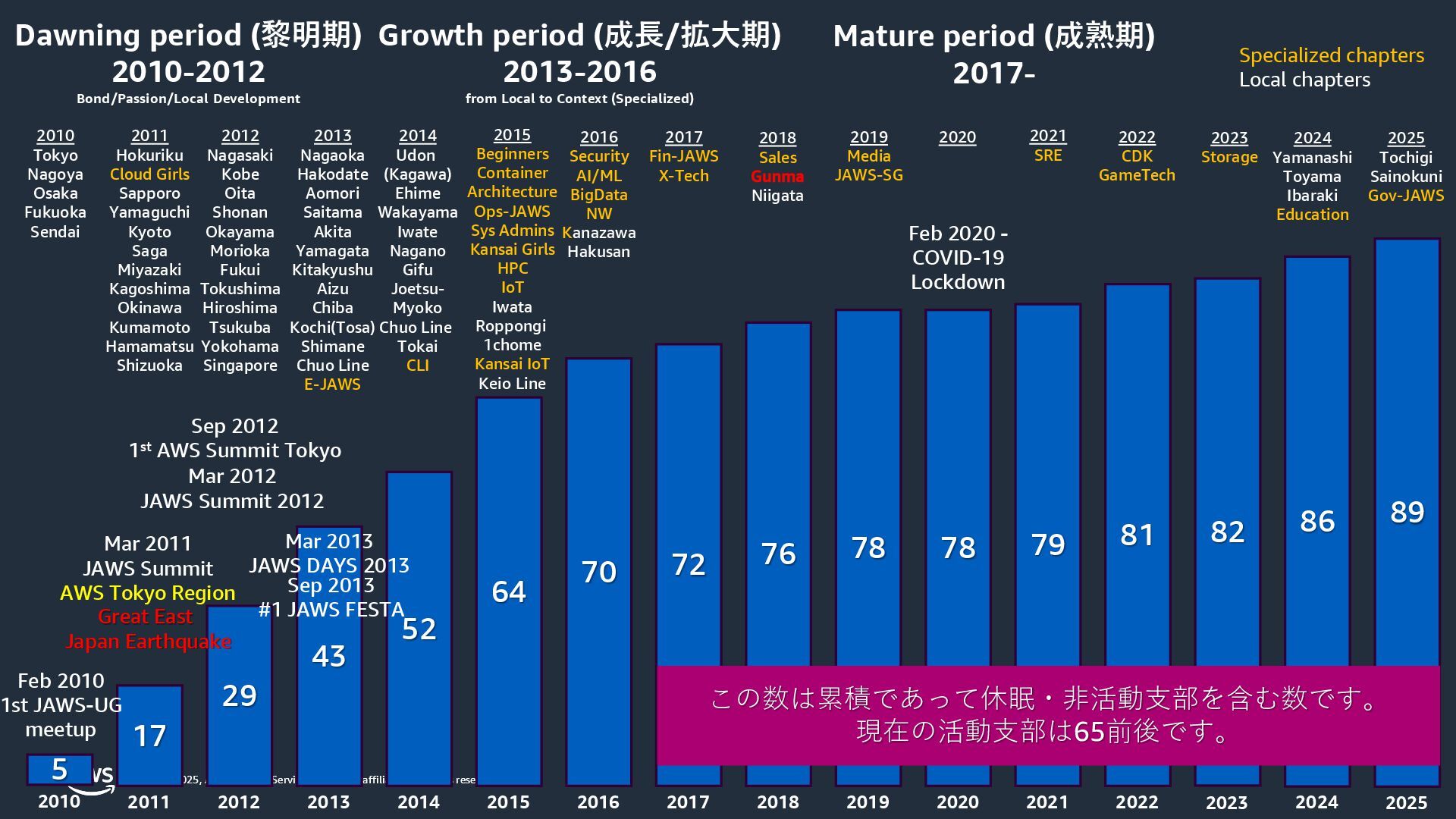 rights reserved. © 2025, Amazon Web Services, Inc. or its affiliates. All rights reserved. Dawning period (黎明期) 2010-2012 Bond/Passion/Local Development Growth period (成長/拡大期) 2013-2016 from Local to Context (Specialized) Mature period (成熟期) 2017- 5 17 29 43 52 64 70 72 76 2010 2011 2012 2013 2014 2015 2016 2017 2018 78 2019 Sep 2013 #1 JAWS FESTA 2015 Beginners Container Architecture Ops-JAWS Sys Admins Kansai Girls HPC IoT Iwata Roppongi 1chome Kansai IoT Keio Line 2016 Security AI/ML BigData NW Kanazawa Hakusan 2017 Fin-JAWS X-Tech 2019 Media JAWS-SG 2018 Sales Gunma Niigata 2010 Tokyo Nagoya Osaka Fukuoka Sendai 2011 Hokuriku Cloud Girls Sapporo Yamaguchi Kyoto Saga Miyazaki Kagoshima Okinawa Kumamoto Hamamatsu Shizuoka 2012 Nagasaki Kobe Oita Shonan Okayama Morioka Fukui Tokushima Hiroshima Tsukuba Yokohama Singapore 2013 Nagaoka Hakodate Aomori Saitama Akita Yamagata Kitakyushu Aizu Chiba Kochi(Tosa) Shimane Chuo Line E-JAWS 2014 Udon (Kagawa) Ehime Wakayama Iwate Nagano Gifu Joetsu- Myoko Chuo Line Tokai CLI Specialized chapters Local chapters 78 2020 Feb 2010 1st JAWS-UG meetup 2020 79 2021 2021 SRE Feb 2020 - COVID-19 Lockdown 2022 CDK GameTech 81 2022 82 2023 2023 Storage 86 2024 Yamanashi Toyama Ibaraki Education 2024 2025 89 2025 Tochigi Sainokuni Gov-JAWS Mar 2012 JAWS Summit 2012 Sep 2012 1st AWS Summit Tokyo この数は累積であって休眠・非活動支部を含む数です。 現在の活動支部は65前後です。 Mar 2011 JAWS Summit AWS Tokyo Region Great East Japan Earthquake Mar 2013 JAWS DAYS 2013