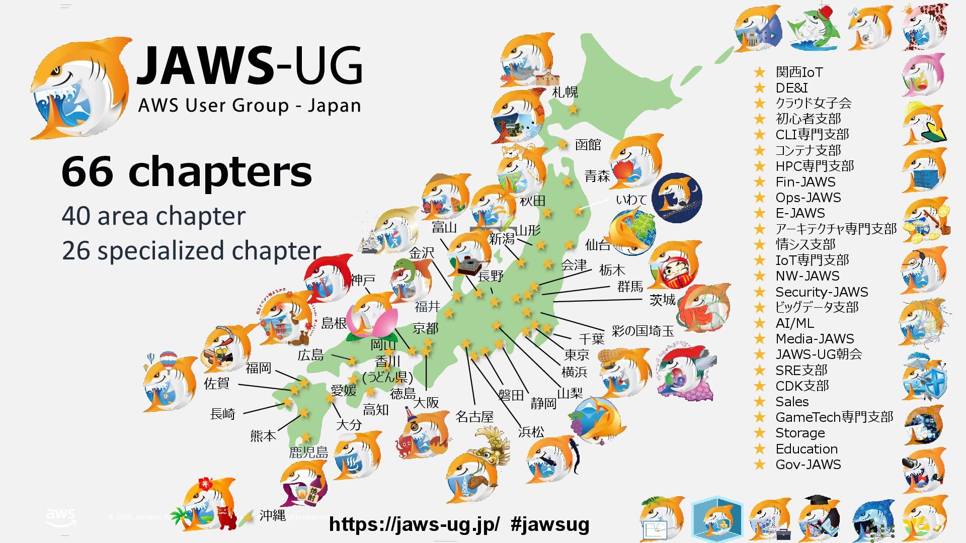 rights reserved. 札幌 函館 青森 秋田 仙台 会津 群馬 栃木 千葉 東京 横浜 名古屋 大阪 徳島 高知 沖縄 熊本 長崎 佐賀 福岡 愛媛 大分 広島 島根 岡山 神戸 京都 金沢 富山 長野 新潟 山形 ★ ★ ★ ★ ★ ★ ★ ★ ★ ★ ★ ★ ★ ★ ★ ★ ★ ★ ★ ★ ★ ★ ★ ★ ★ ★ ★ ★ ★ ★ ★ ★ ★ ★★ ★ いわて ★ https://jaws-ug.jp/ #jawsug 66 chapters ★ 関西IoT ★ DE&I ★ クラウド女子会 ★ 初心者支部 ★ CLI専門支部 ★ コンテナ支部 ★ HPC専門支部 ★ Fin-JAWS ★ Ops-JAWS ★ E-JAWS ★ アーキテクチャ専門支部 ★ 情シス支部 ★ IoT専門支部 ★ NW-JAWS ★ Security-JAWS ★ ビッグデータ支部 ★ AI/ML ★ Media-JAWS ★ JAWS-UG朝会 ★ SRE支部 ★ CDK支部 ★ Sales ★ GameTech専門支部 ★ Storage ★ Education ★ Gov-JAWS 磐田 浜松 静岡 茨城 ★ 山梨 40 area chapter 26 specialized chapter ★ 彩の国埼玉 ★ 鹿児島 ★ 福井 ★ 香川 (うどん県)