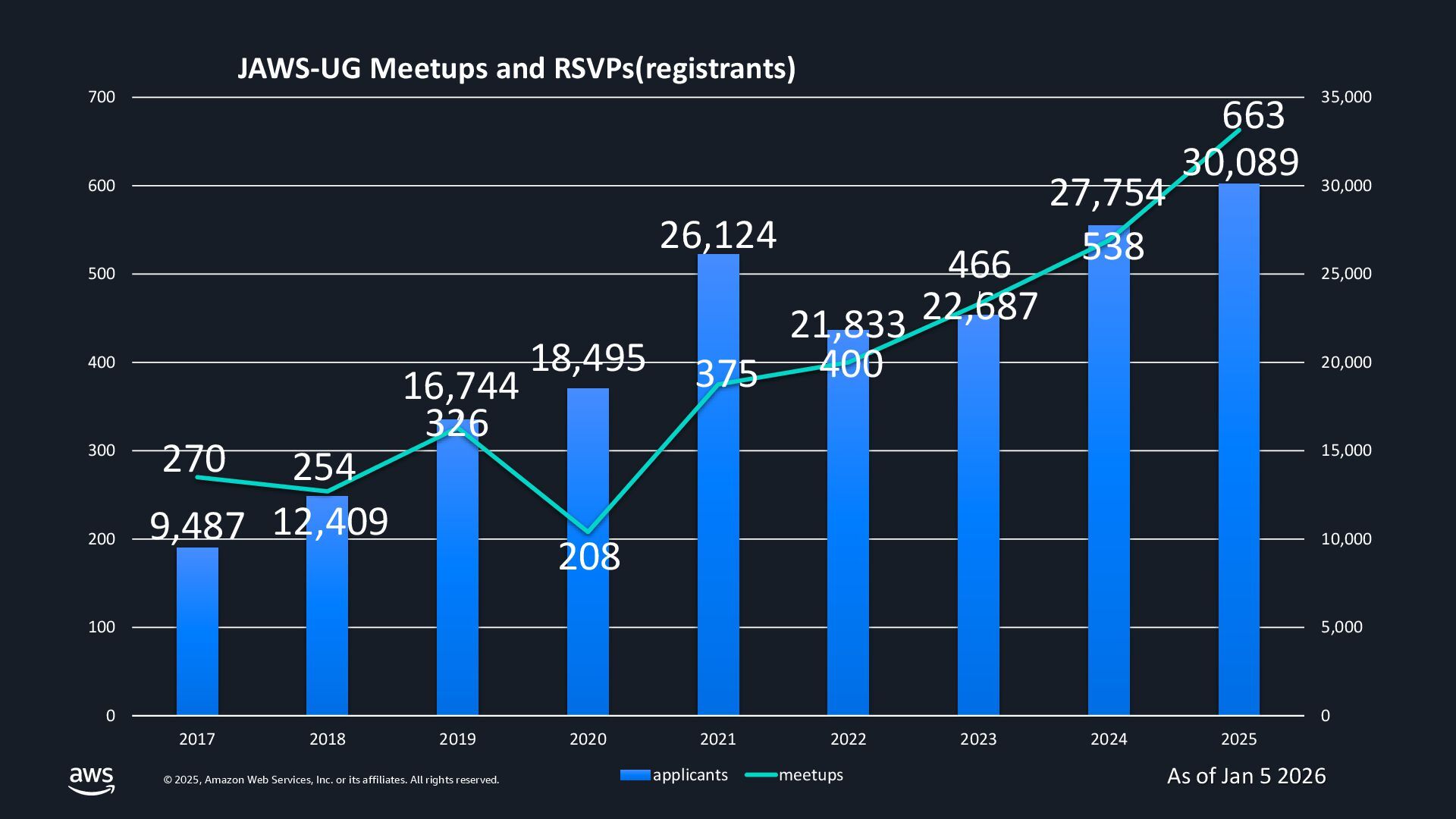 rights reserved. 9,487 12,409 16,744 18,495 26,124 21,833 22,687 27,754 30,089 270 254 326 208 375 400 466 538 663 0 5,000 10,000 15,000 20,000 25,000 30,000 35,000 0 100 200 300 400 500 600 700 2017 2018 2019 2020 2021 2022 2023 2024 2025 JAWS-UG Meetups and RSVPs(registrants) applicants meetups As of Jan 5 2026