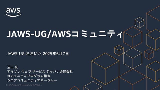 2021, Amazon Web Services, Inc. or its Affiliates. • Have fun • 一人ではできない発見や学び、成長を楽しみたい • Make a difference • 新しいテクノロジーで社会・地域に貢献したい • Go global • 世界中のAWSユーザーと繋がり世界に貢献したい • Find new heroes • コミュニティへの貢献がヒーローを生み出す 参照 JAWS-UGの価値観(ステートメント) https://jaws-ug.jp/about-us/