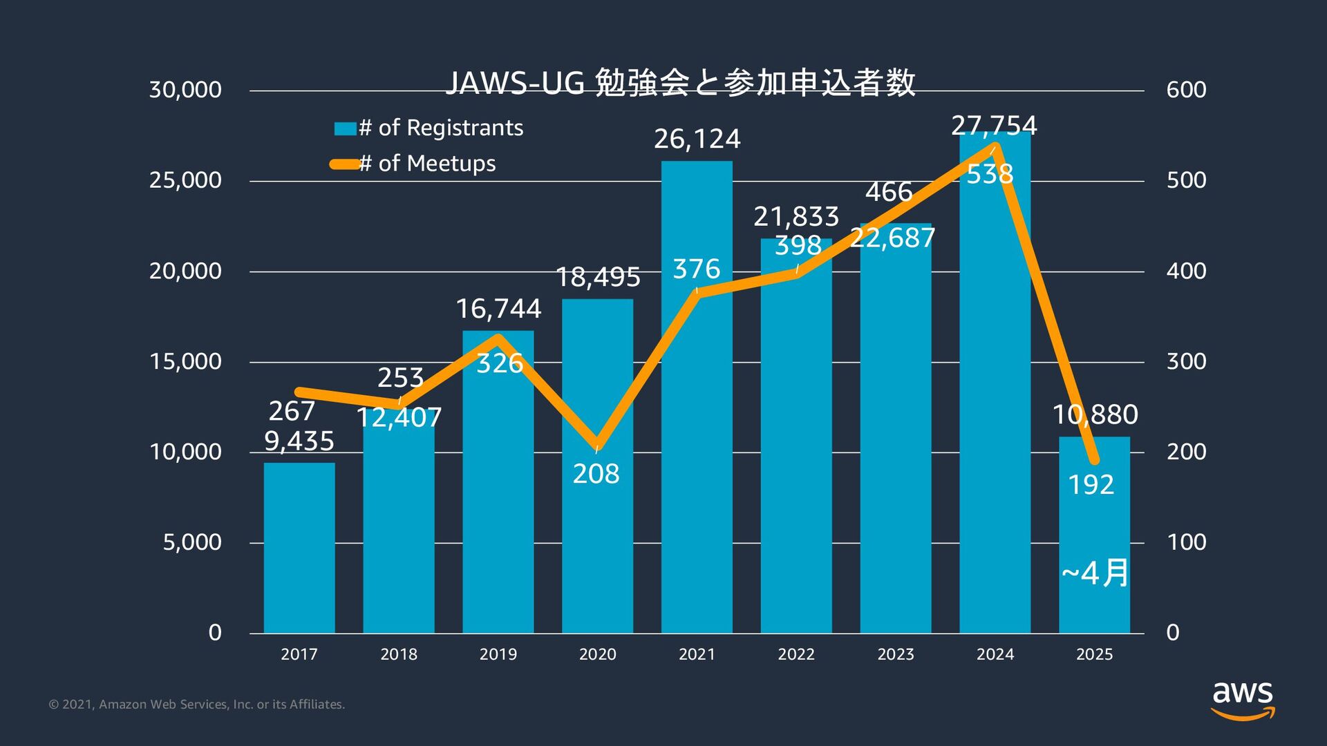 Communities 2025 Mar 登録メンバー数 登録コミュニティメンバー数 #0 JAWS-UG 全国 15,971 (D) 13,678 (+16.3%) #1 JAWS-UG 初心者支部 5,174 (C) 4,524 (+13.6%) #2 JAWS-UG 東京支部 5,118 (C) 2,111 (+133.2%) #3 JAWS-UG コンテナ支部 4,055 (C) 3,555 (+14.2%) #4 JAWS-UG AI/ML支部 4,036 (C) 1,819 (+116.5%) #5 AWS Startup Community 3,185 (C) 2,197 (+43.5%) #6 NW-JAWS 2,778 (C) 1,328 (+83.5%) #7 JAWS-UG アーキ専門支部 2,718 (C) 2,552 (+6.4%) #8 JAWS-UG 横浜支部 2,107 (C) 1,621 (+29.3%) #9 JAWS-UG SRE支部 2,027 (C) 1,104 (+83.4%) #10 Fin-JAWS 1,888 (C) 1,393 (+33.7%) Security-JAWS 4,375(D) -> 1,176(C), JAWS-UG関西 3,363(D)-> Osaka 262(C), 京都(122) 2025/3/25 2023/4/1 (% growth to 2025)