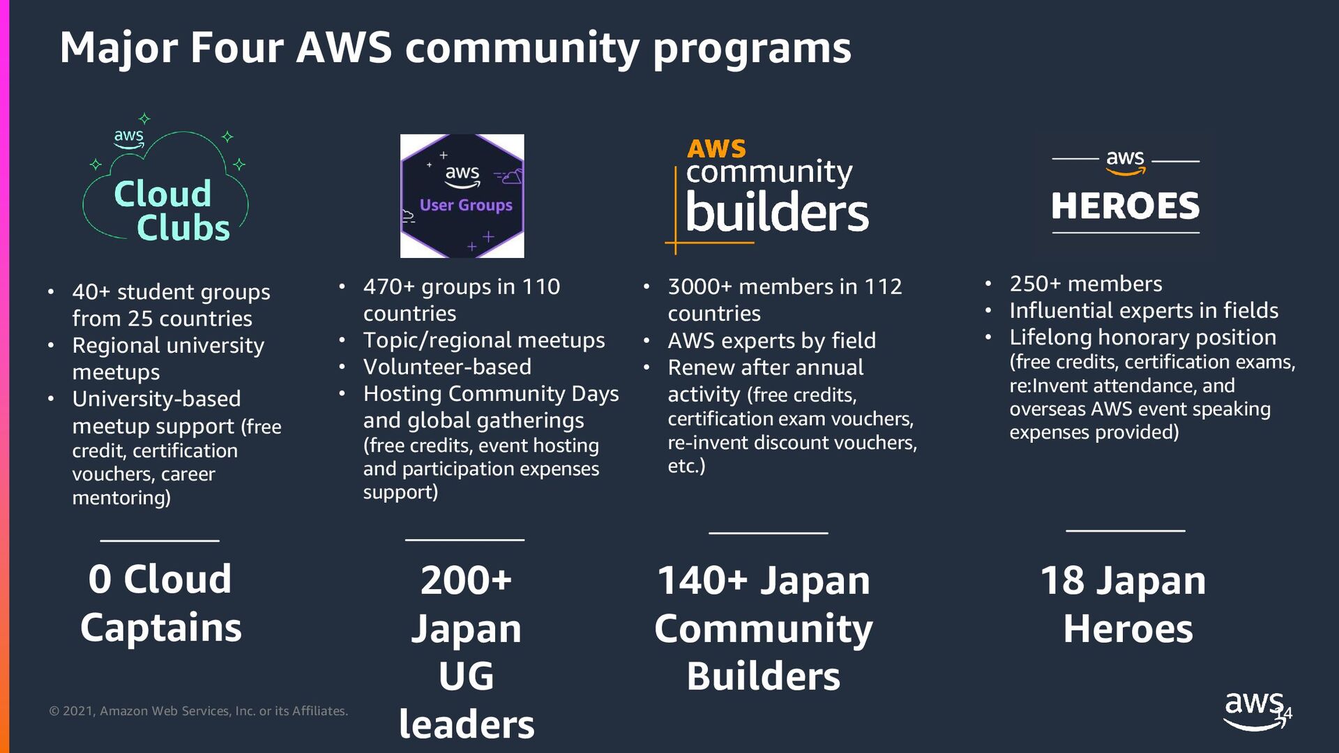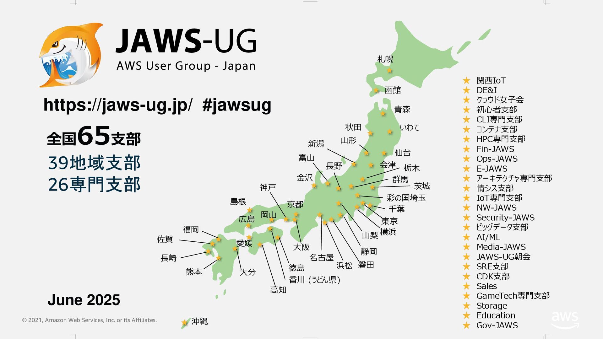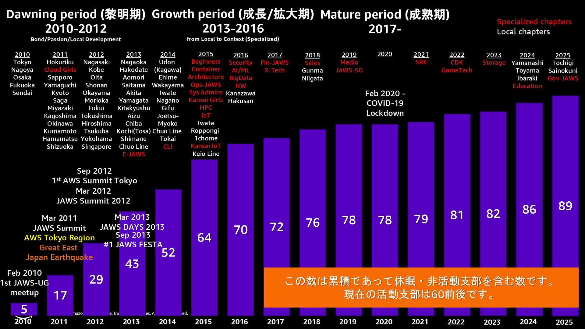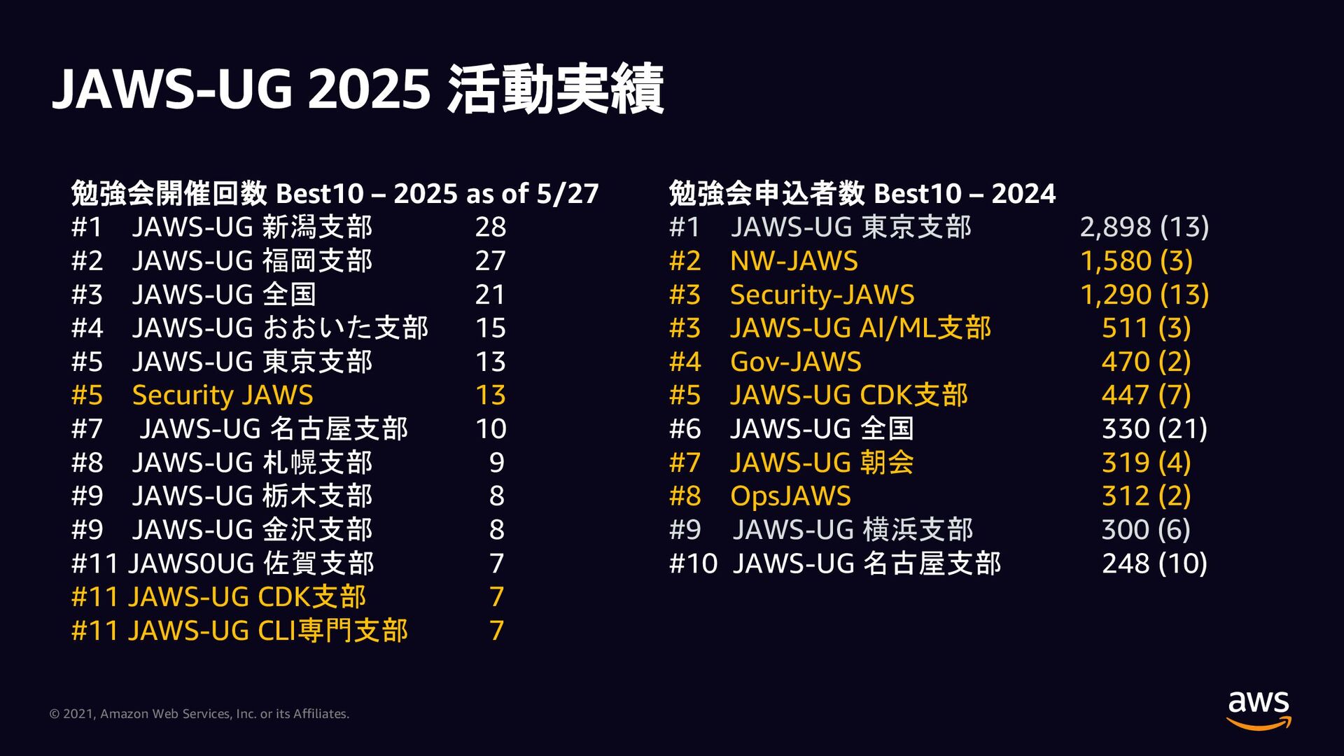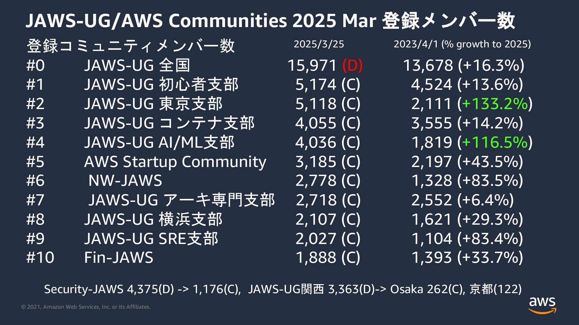 Communities 2025 Mar 登録メンバー数 登録コミュニティメンバー数 #0 JAWS-UG 全国 15,971 (D) 13,678 (+16.3%) #1 JAWS-UG 初心者支部 5,174 (C) 4,524 (+13.6%) #2 JAWS-UG 東京支部 5,118 (C) 2,111 (+133.2%) #3 JAWS-UG コンテナ支部 4,055 (C) 3,555 (+14.2%) #4 JAWS-UG AI/ML支部 4,036 (C) 1,819 (+116.5%) #5 AWS Startup Community 3,185 (C) 2,197 (+43.5%) #6 NW-JAWS 2,778 (C) 1,328 (+83.5%) #7 JAWS-UG アーキ専門支部 2,718 (C) 2,552 (+6.4%) #8 JAWS-UG 横浜支部 2,107 (C) 1,621 (+29.3%) #9 JAWS-UG SRE支部 2,027 (C) 1,104 (+83.4%) #10 Fin-JAWS 1,888 (C) 1,393 (+33.7%) Security-JAWS 4,375(D) -> 1,176(C), JAWS-UG関西 3,363(D)-> Osaka 262(C), 京都(122) 2025/3/25 2023/4/1 (% growth to 2025)