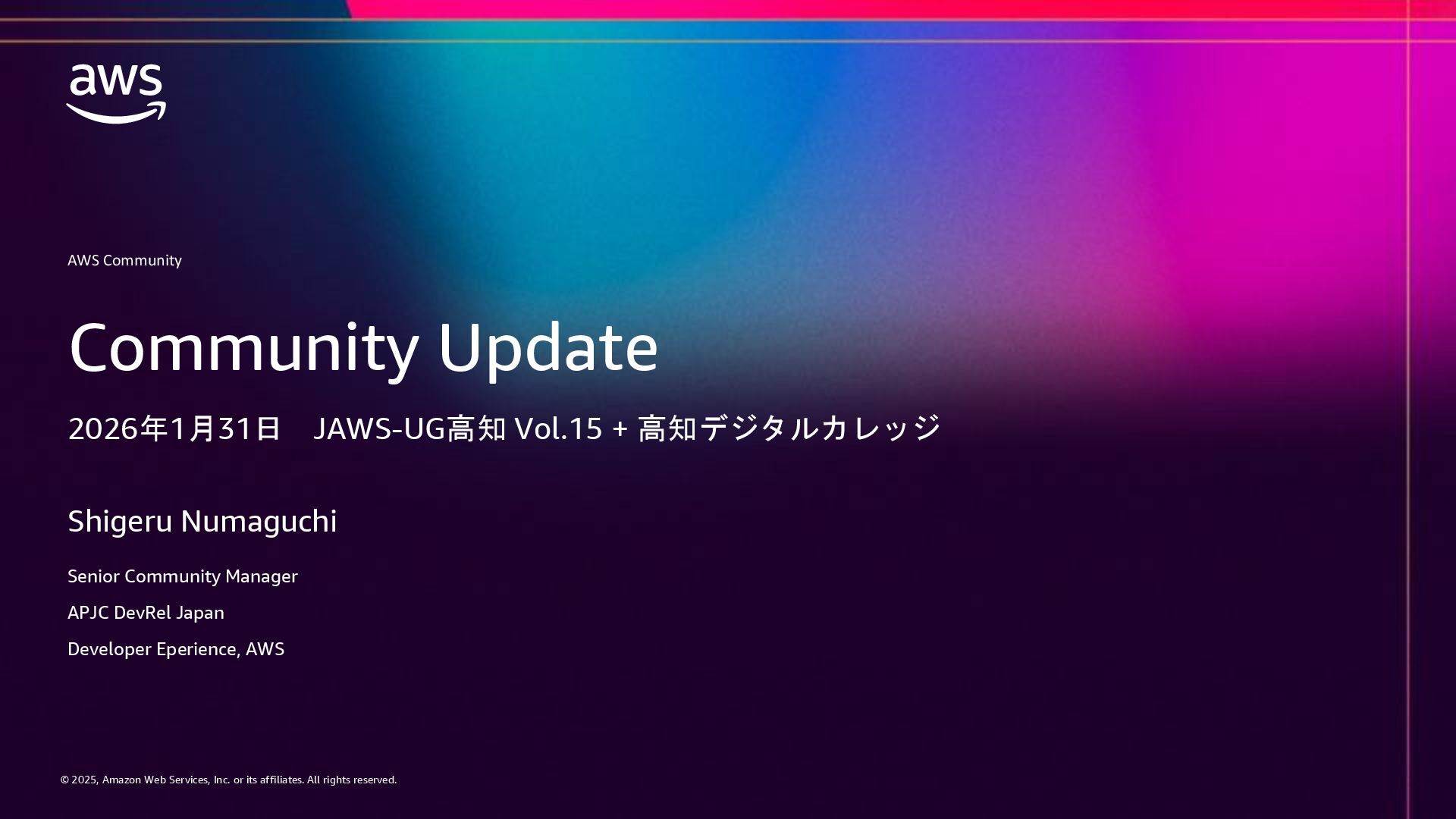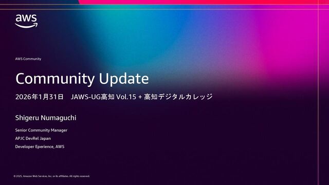 rights reserved. © 2025, Amazon Web Services, Inc. or its affiliates. All rights reserved. AWS Community Shigeru Numaguchi Senior Community Manager APJC DevRel Japan Developer Eperience, AWS Community Update 2026年1月31日 JAWS-UG高知 Vol.15 + 高知デジタルカレッジ