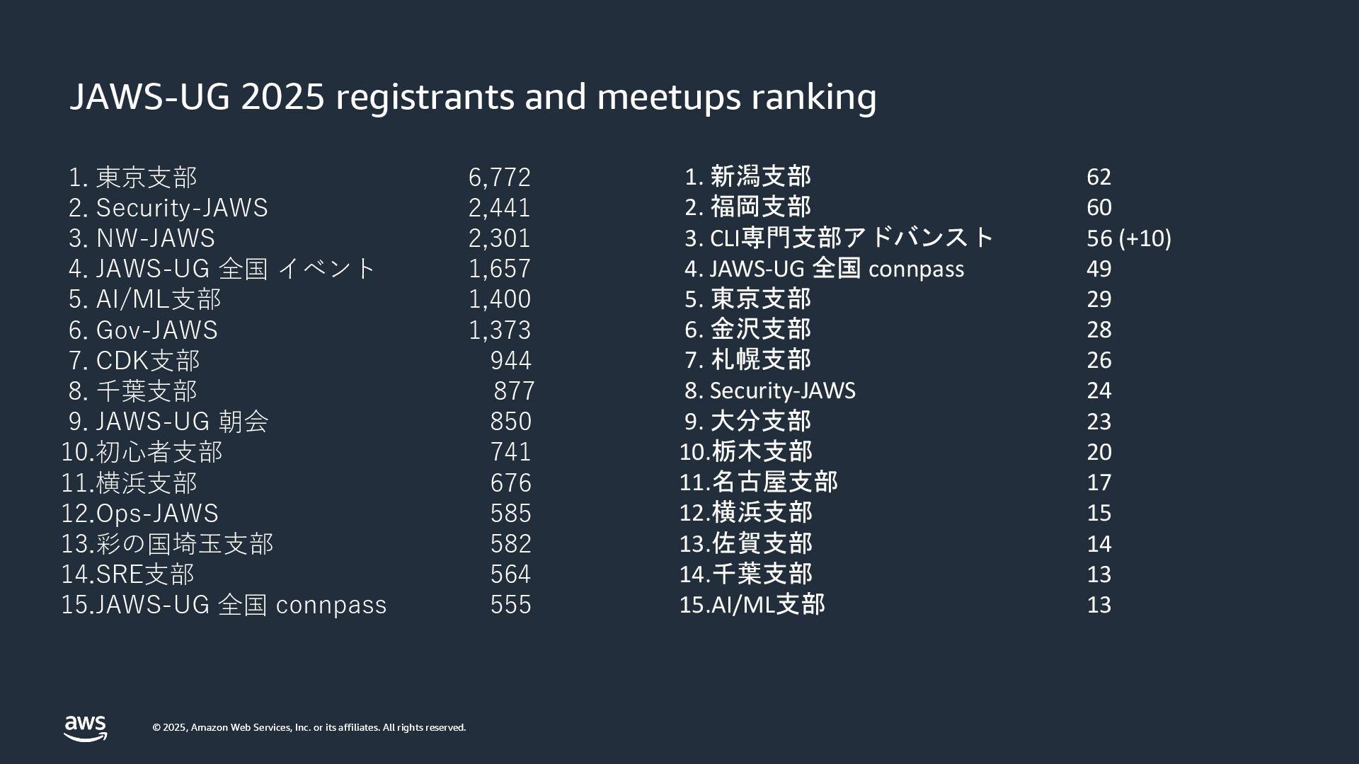rights reserved. © 2025, Amazon Web Services, Inc. or its affiliates. All rights reserved. 1. 東京支部 6,772 2. Security-JAWS 2,441 3. NW-JAWS 2,301 4. JAWS-UG 全国 イベント 1,657 5. AI/ML支部 1,400 6. Gov-JAWS 1,373 7. CDK支部 944 8. 千葉支部 877 9. JAWS-UG 朝会 850 10.初心者支部 741 11.横浜支部 676 12.Ops-JAWS 585 13.彩の国埼玉支部 582 14.SRE支部 564 15.JAWS-UG 全国 connpass 555 1. 新潟支部 62 2. 福岡支部 60 3. CLI専門支部アドバンスト 56 (+10) 4. JAWS-UG 全国 connpass 49 5. 東京支部 29 6. 金沢支部 28 7. 札幌支部 26 8. Security-JAWS 24 9. 大分支部 23 10.栃木支部 20 11.名古屋支部 17 12.横浜支部 15 13.佐賀支部 14 14.千葉支部 13 15.AI/ML支部 13 JAWS-UG 2025 registrants and meetups ranking