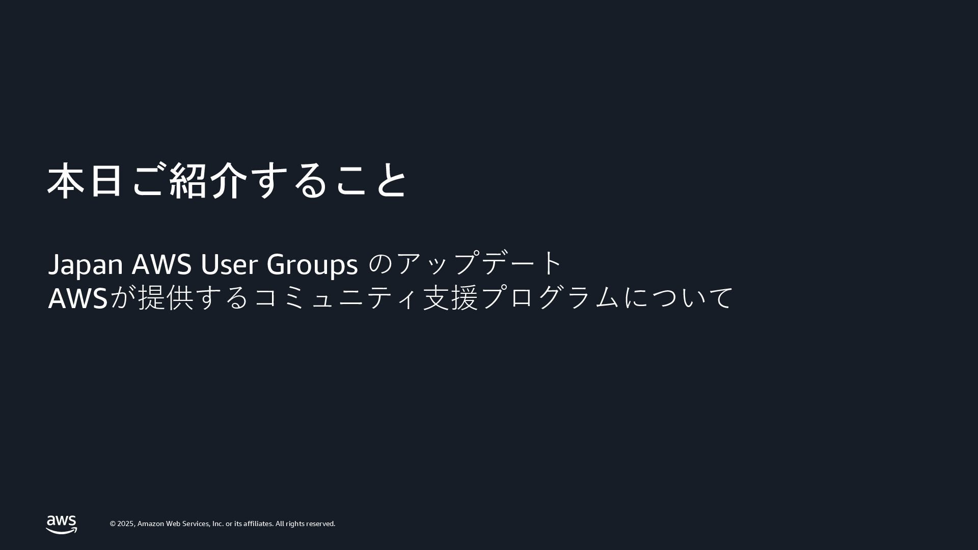 rights reserved. Japan AWS User Groups のアップデート AWSが提供するコミュニティ支援プログラムについて 本日ご紹介すること