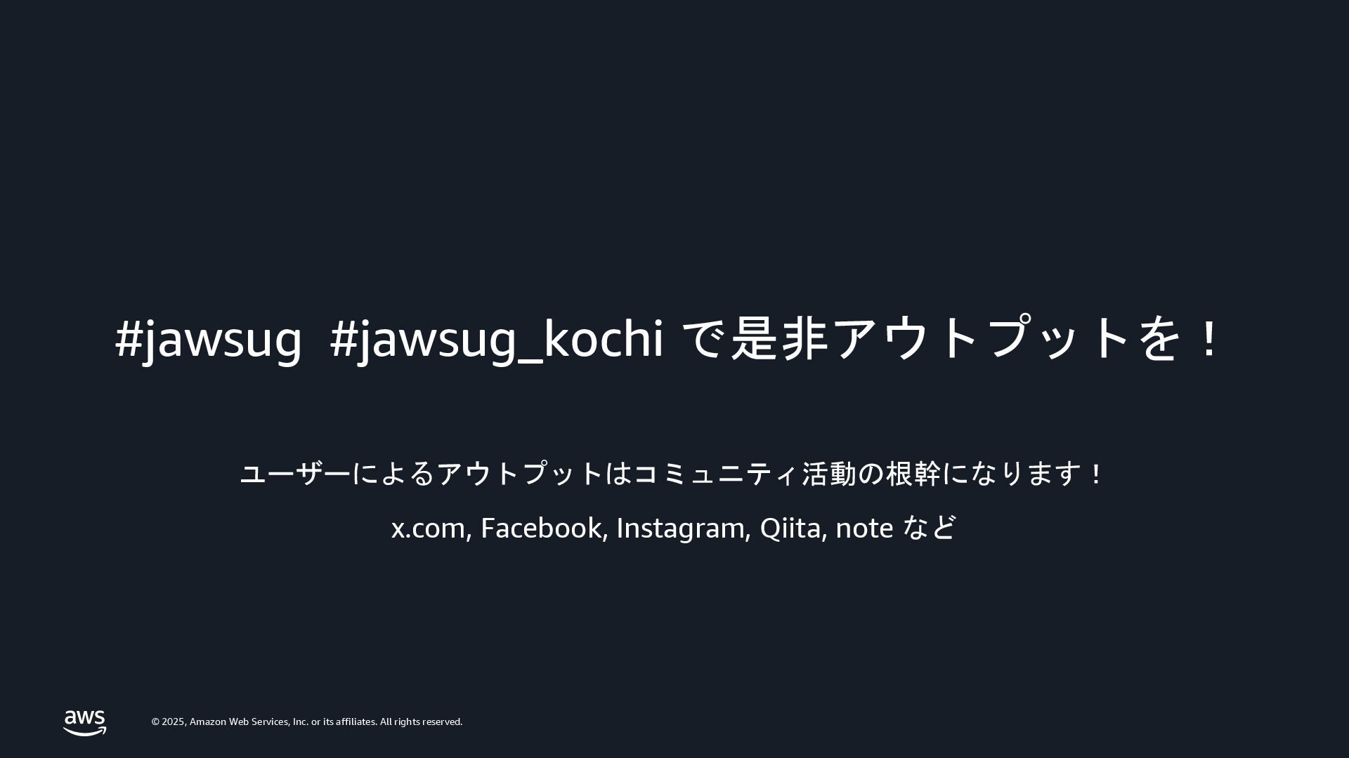 rights reserved. #jawsug #jawsug_kochi で是非アウトプットを! ユーザーによるアウトプットはコミュニティ活動の根幹になります! x.com, Facebook, Instagram, Qiita, note など
