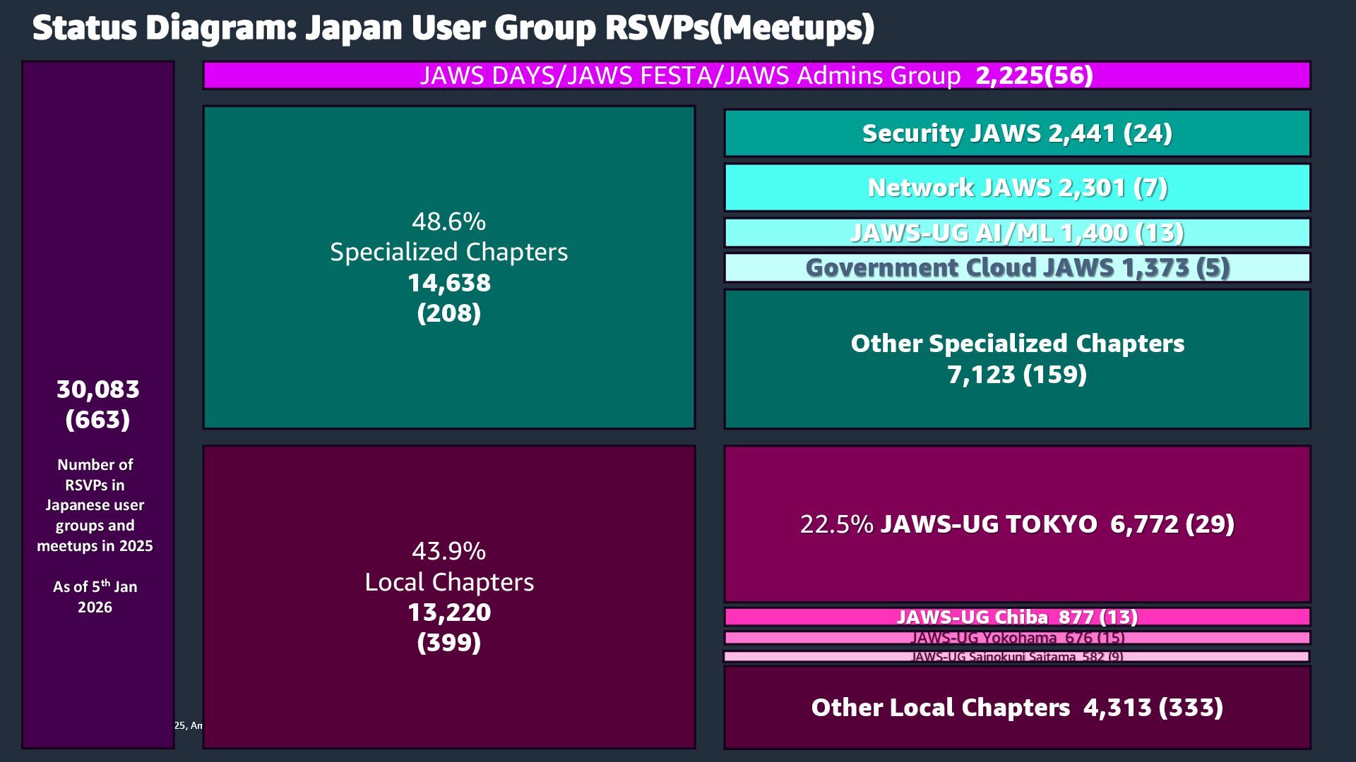 rights reserved. © 2025, Amazon Web Services, Inc. or its affiliates. All rights reserved. Status Diagram: Japan User Group RSVPs(Meetups) 30,083 (663) 22.5% JAWS-UG TOKYO 6,772 (29) 48.6% Specialized Chapters 14,638 (208) JAWS DAYS/JAWS FESTA/JAWS Admins Group 2,225(56) 43.9% Local Chapters 13,220 (399) Security JAWS 2,441 (24) Network JAWS 2,301 (7) JAWS-UG AI/ML 1,400 (13) Government Cloud JAWS 1,373 (5) Other Specialized Chapters 7,123 (159) JAWS-UG Chiba 877 (13) JAWS-UG Yokohama 676 (15) JAWS-UG Sainokuni Saitama 582 (9) Other Local Chapters 4,313 (333) Number of RSVPs in Japanese user groups and meetups in 2025 As of 5th Jan 2026