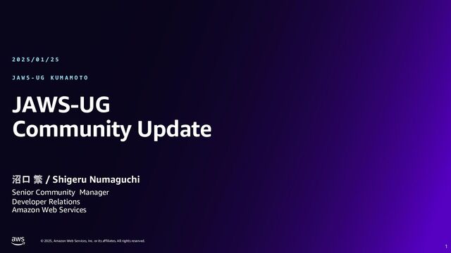 rights reserved. J A W S - U G K U M A M O T O JAWS-UG Community Update 沼口 繁 / Shigeru Numaguchi 2 0 2 5 / 0 1 / 2 5 Senior Community Manager Developer Relations Amazon Web Services 1