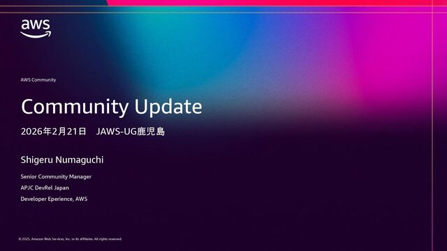 rights reserved. © 2025, Amazon Web Services, Inc. or its affiliates. All rights reserved. AWS Community Shigeru Numaguchi Senior Community Manager APJC DevRel Japan Developer Eperience, AWS Community Update 2026年2月21日 JAWS-UG鹿児島