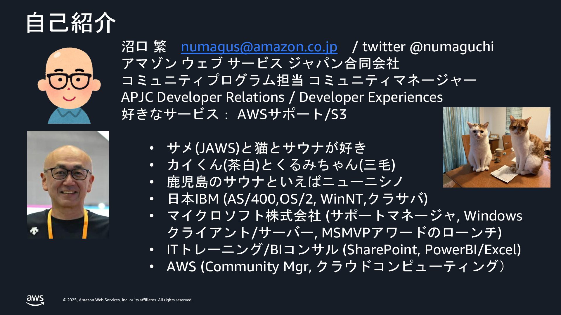 / twitter @numaguchi アマゾン ウェブ サービス ジャパン合同会社 コミュニティプログラム担当 コミュニティマネージャー APJC Developer Relations / Developer Experiences 好きなサービス: AWSサポート/S3 • サメ(JAWS)と猫とサウナが好き • カイくん(茶白)とくるみちゃん(三毛) • 鹿児島のサウナといえばニューニシノ • 日本IBM (AS/400,OS/2, WinNT,クラサバ) • マイクロソフト株式会社 (サポートマネージャ, Windows クライアント/サーバー, MSMVPアワードのローンチ) • ITトレーニング/BIコンサル (SharePoint, PowerBI/Excel) • AWS (Community Mgr, クラウドコンピューティング)