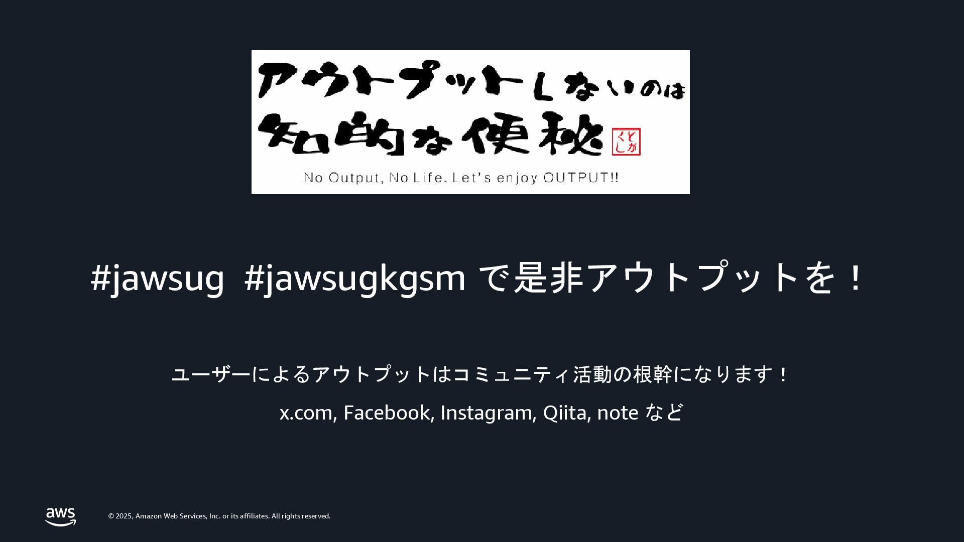 rights reserved. #jawsug #jawsugkgsm で是非アウトプットを! ユーザーによるアウトプットはコミュニティ活動の根幹になります! x.com, Facebook, Instagram, Qiita, note など