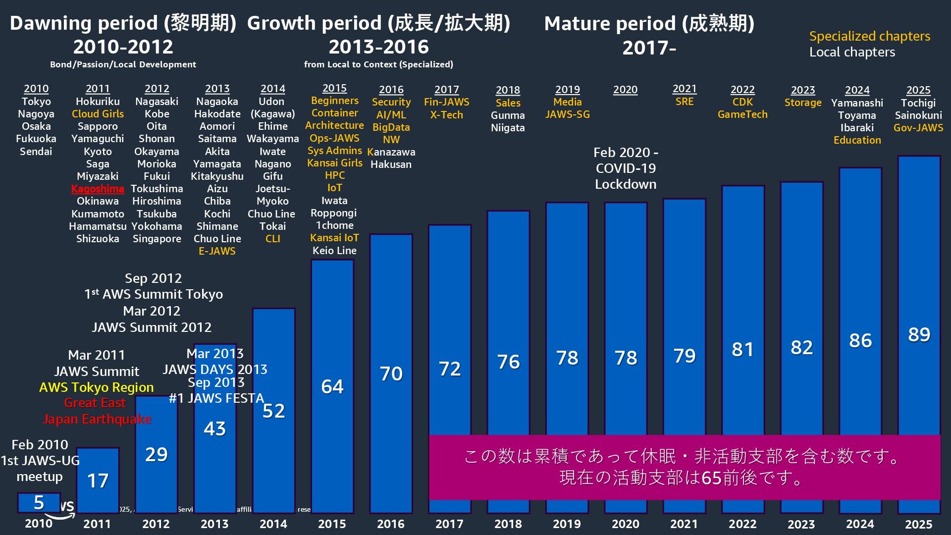 rights reserved. © 2025, Amazon Web Services, Inc. or its affiliates. All rights reserved. Dawning period (黎明期) 2010-2012 Bond/Passion/Local Development Growth period (成長/拡大期) 2013-2016 from Local to Context (Specialized) Mature period (成熟期) 2017- 5 17 29 43 52 64 70 72 76 2010 2011 2012 2013 2014 2015 2016 2017 2018 78 2019 Sep 2013 #1 JAWS FESTA 2015 Beginners Container Architecture Ops-JAWS Sys Admins Kansai Girls HPC IoT Iwata Roppongi 1chome Kansai IoT Keio Line 2016 Security AI/ML BigData NW Kanazawa Hakusan 2017 Fin-JAWS X-Tech 2019 Media JAWS-SG 2018 Sales Gunma Niigata 2010 Tokyo Nagoya Osaka Fukuoka Sendai 2011 Hokuriku Cloud Girls Sapporo Yamaguchi Kyoto Saga Miyazaki Kagoshima Okinawa Kumamoto Hamamatsu Shizuoka 2012 Nagasaki Kobe Oita Shonan Okayama Morioka Fukui Tokushima Hiroshima Tsukuba Yokohama Singapore 2013 Nagaoka Hakodate Aomori Saitama Akita Yamagata Kitakyushu Aizu Chiba Kochi Shimane Chuo Line E-JAWS 2014 Udon (Kagawa) Ehime Wakayama Iwate Nagano Gifu Joetsu- Myoko Chuo Line Tokai CLI Specialized chapters Local chapters 78 2020 Feb 2010 1st JAWS-UG meetup 2020 79 2021 2021 SRE Feb 2020 - COVID-19 Lockdown 2022 CDK GameTech 81 2022 82 2023 2023 Storage 86 2024 Yamanashi Toyama Ibaraki Education 2024 2025 89 2025 Tochigi Sainokuni Gov-JAWS Mar 2012 JAWS Summit 2012 Sep 2012 1st AWS Summit Tokyo この数は累積であって休眠・非活動支部を含む数です。 現在の活動支部は65前後です。 Mar 2011 JAWS Summit AWS Tokyo Region Great East Japan Earthquake Mar 2013 JAWS DAYS 2013