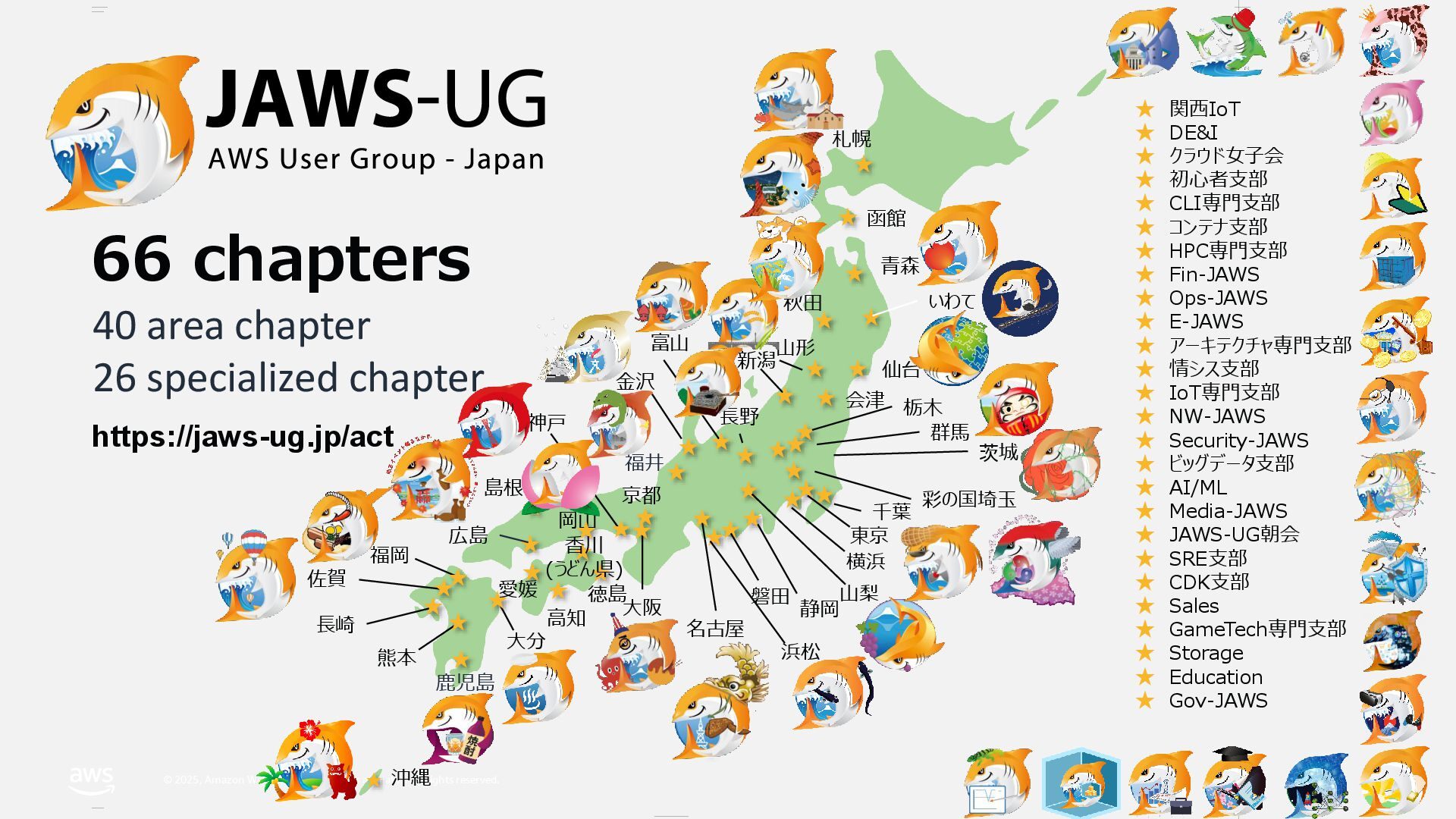 rights reserved. 札幌 函館 青森 秋田 仙台 会津 群馬 栃木 千葉 東京 横浜 名古屋 大阪 徳島 高知 沖縄 熊本 長崎 佐賀 福岡 愛媛 大分 広島 島根 岡山 神戸 京都 金沢 富山 長野 新潟 山形 ★ ★ ★ ★ ★ ★ ★ ★ ★ ★ ★ ★ ★ ★ ★ ★ ★ ★ ★ ★ ★ ★ ★ ★ ★ ★ ★ ★ ★ ★ ★ ★ ★ ★★ ★ いわて ★ https://jaws-ug.jp/act 66 chapters ★ 関西IoT ★ DE&I ★ クラウド女子会 ★ 初心者支部 ★ CLI専門支部 ★ コンテナ支部 ★ HPC専門支部 ★ Fin-JAWS ★ Ops-JAWS ★ E-JAWS ★ アーキテクチャ専門支部 ★ 情シス支部 ★ IoT専門支部 ★ NW-JAWS ★ Security-JAWS ★ ビッグデータ支部 ★ AI/ML ★ Media-JAWS ★ JAWS-UG朝会 ★ SRE支部 ★ CDK支部 ★ Sales ★ GameTech専門支部 ★ Storage ★ Education ★ Gov-JAWS 磐田 浜松 静岡 茨城 ★ 山梨 40 area chapter 26 specialized chapter ★ 彩の国埼玉 ★ 鹿児島 ★ 福井 ★ 香川 (うどん県)