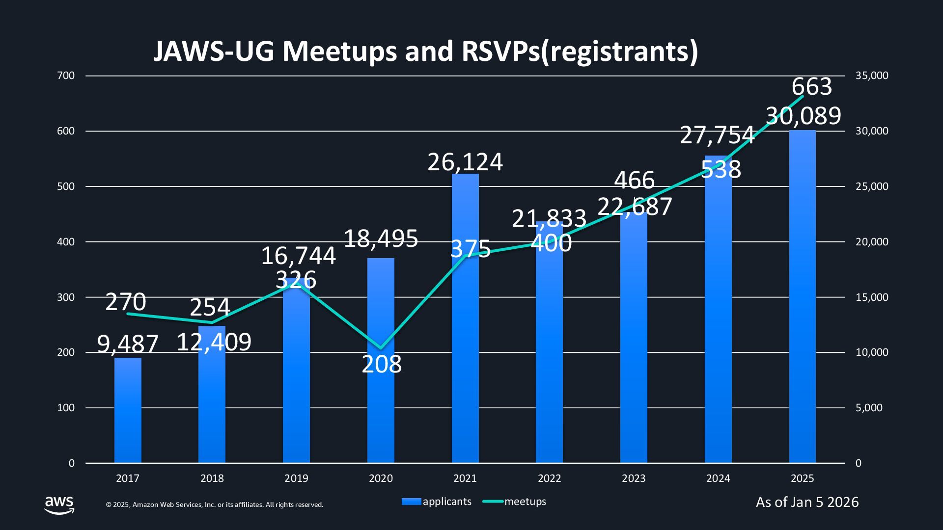 rights reserved. 9,487 12,409 16,744 18,495 26,124 21,833 22,687 27,754 30,089 270 254 326 208 375 400 466 538 663 0 5,000 10,000 15,000 20,000 25,000 30,000 35,000 0 100 200 300 400 500 600 700 2017 2018 2019 2020 2021 2022 2023 2024 2025 JAWS-UG Meetups and RSVPs(registrants) applicants meetups As of Jan 5 2026
