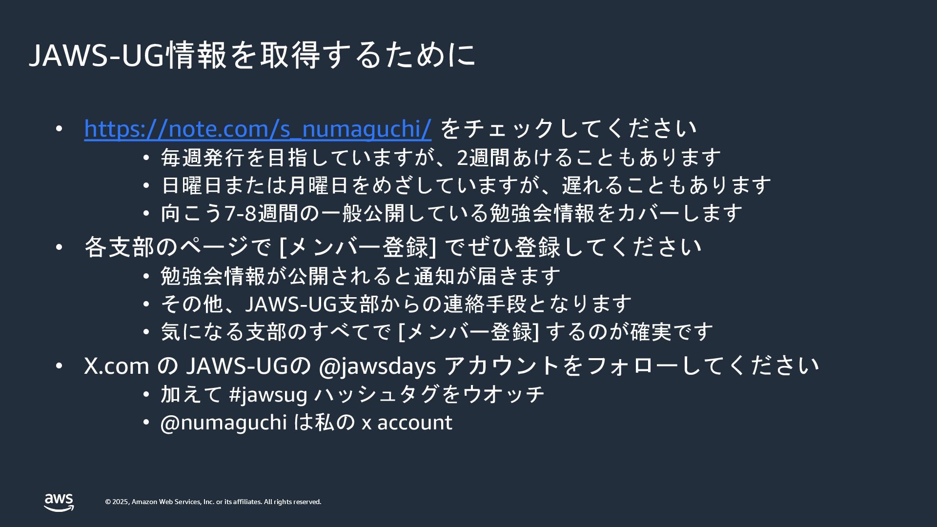 rights reserved. © 2025, Amazon Web Services, Inc. or its affiliates. All rights reserved. JAWS-UG情報を取得するために • https://note.com/s_numaguchi/ をチェックしてください • 毎週発行を目指していますが、2週間あけることもあります • 日曜日または月曜日をめざしていますが、遅れることもあります • 向こう7-8週間の一般公開している勉強会情報をカバーします • 各支部のページで [メンバー登録] でぜひ登録してください • 勉強会情報が公開されると通知が届きます • その他、JAWS-UG支部からの連絡手段となります • 気になる支部のすべてで [メンバー登録] するのが確実です • X.com の JAWS-UGの @jawsdays アカウントをフォローしてください • 加えて #jawsug ハッシュタグをウオッチ • @numaguchi は私の x account