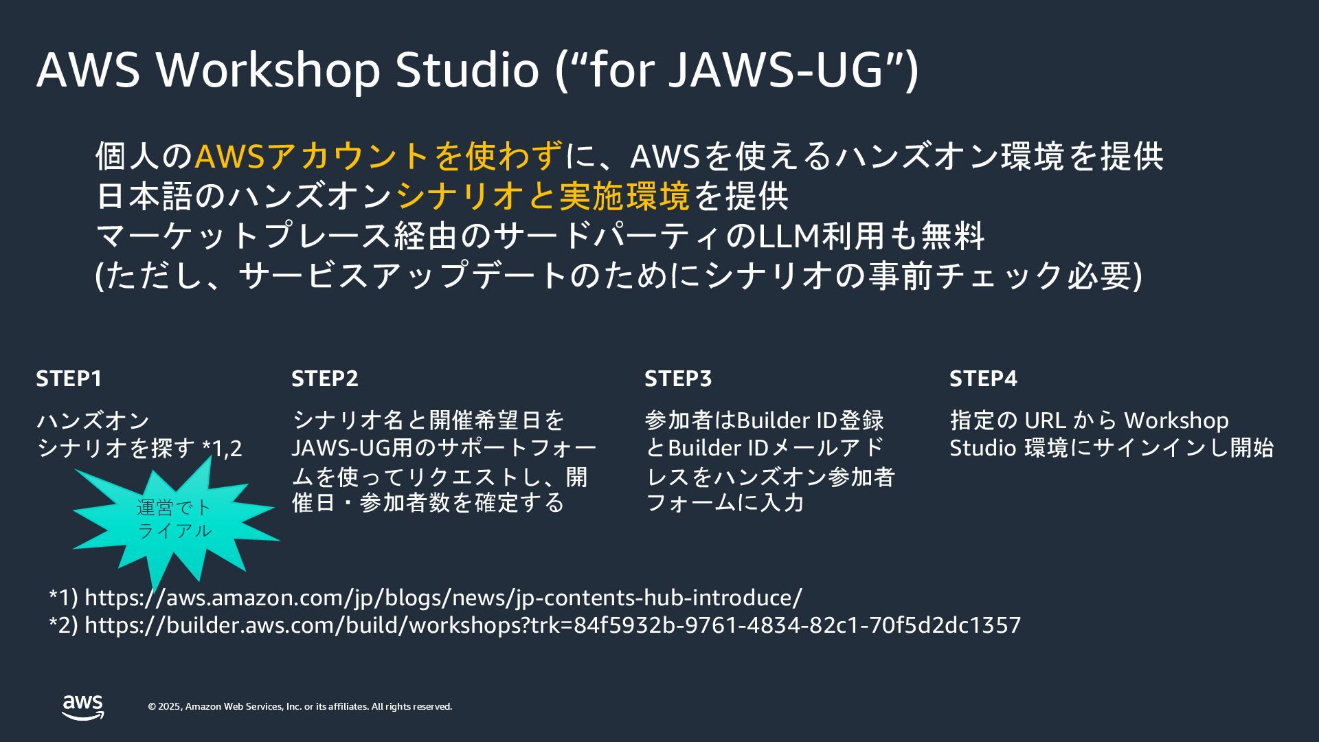 rights reserved. © 2025, Amazon Web Services, Inc. or its affiliates. All rights reserved. AWS Workshop Studio (“for JAWS-UG”) 個人のAWSアカウントを使わずに、AWSを使えるハンズオン環境を提供 日本語のハンズオンシナリオと実施環境を提供 マーケットプレース経由のサードパーティのLLM利用も無料 (ただし、サービスアップデートのためにシナリオの事前チェック必要) STEP1 ハンズオン シナリオを探す *1,2 *1) https://aws.amazon.com/jp/blogs/news/jp-contents-hub-introduce/ *2) https://builder.aws.com/build/workshops?trk=84f5932b-9761-4834-82c1-70f5d2dc1357 STEP2 シナリオ名と開催希望日を JAWS-UG用のサポートフォー ムを使ってリクエストし、開 催日・参加者数を確定する STEP3 参加者はBuilder ID登録 とBuilder IDメールアド レスをハンズオン参加者 フォームに入力 STEP4 指定の URL から Workshop Studio 環境にサインインし開始 運営でト ライアル