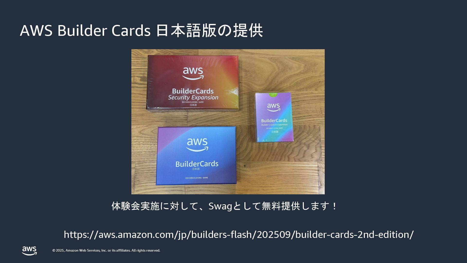 rights reserved. © 2025, Amazon Web Services, Inc. or its affiliates. All rights reserved. AWS Builder Cards 日本語版の提供 https://aws.amazon.com/jp/builders-flash/202509/builder-cards-2nd-edition/ 体験会実施に対して、Swagとして無料提供します!